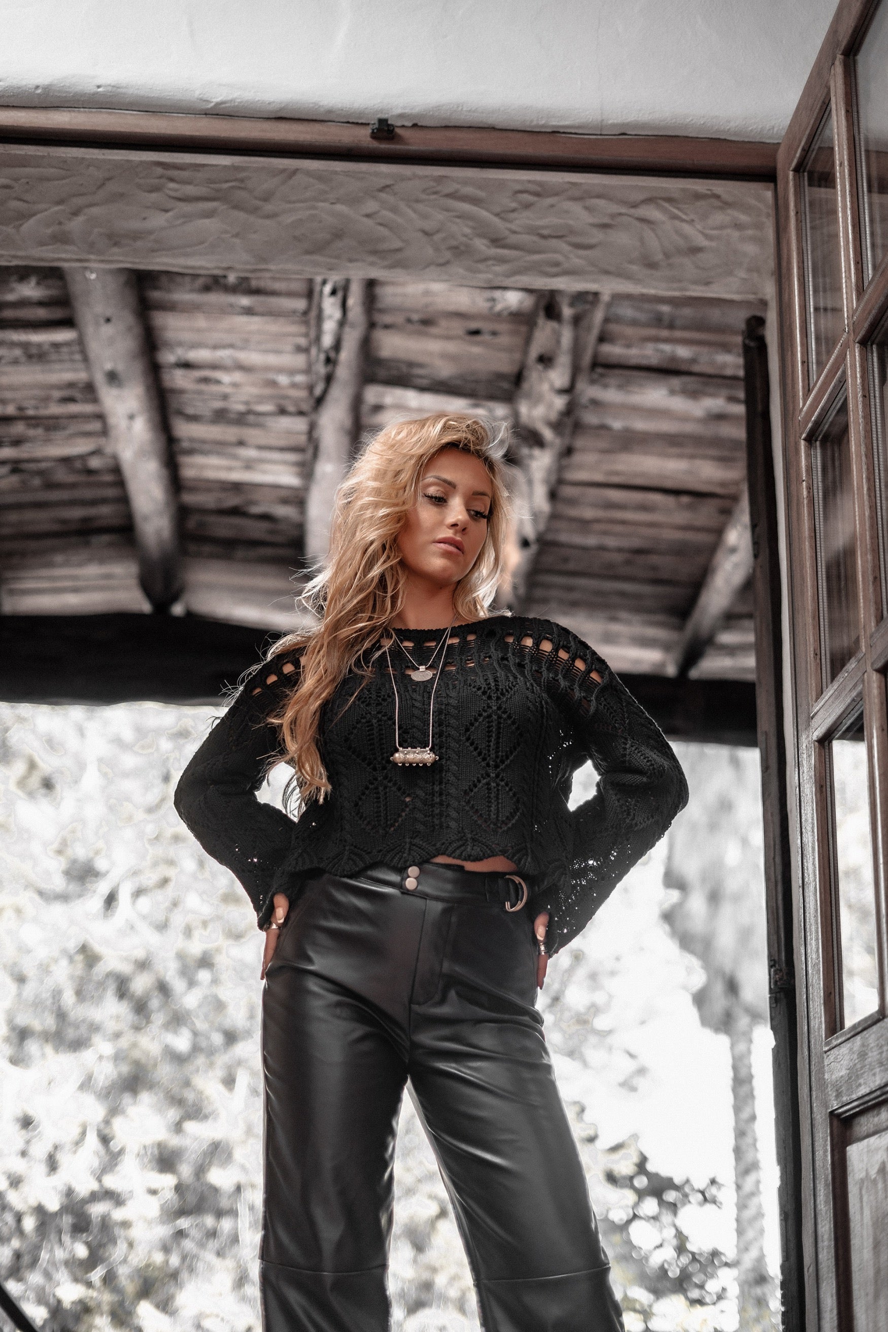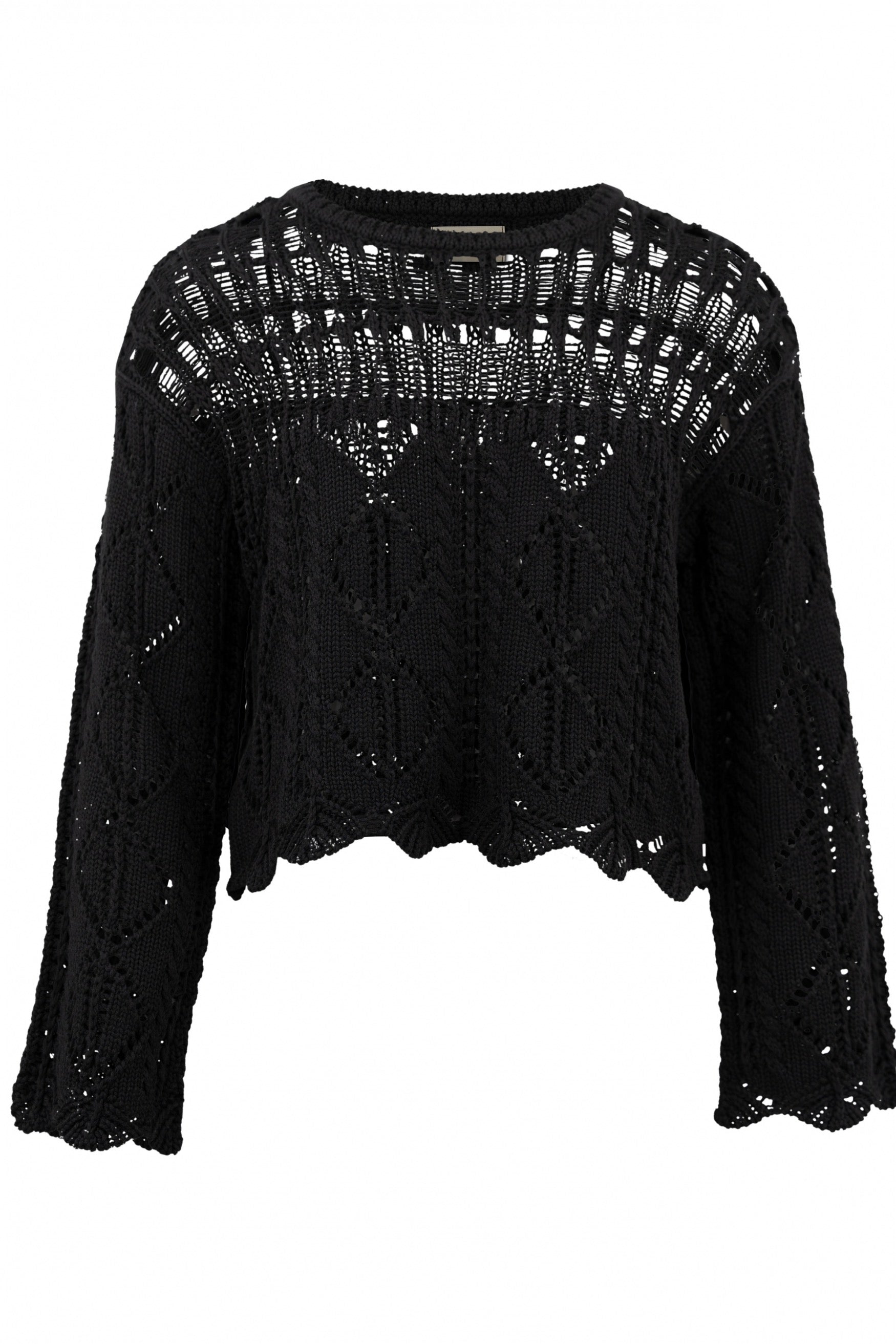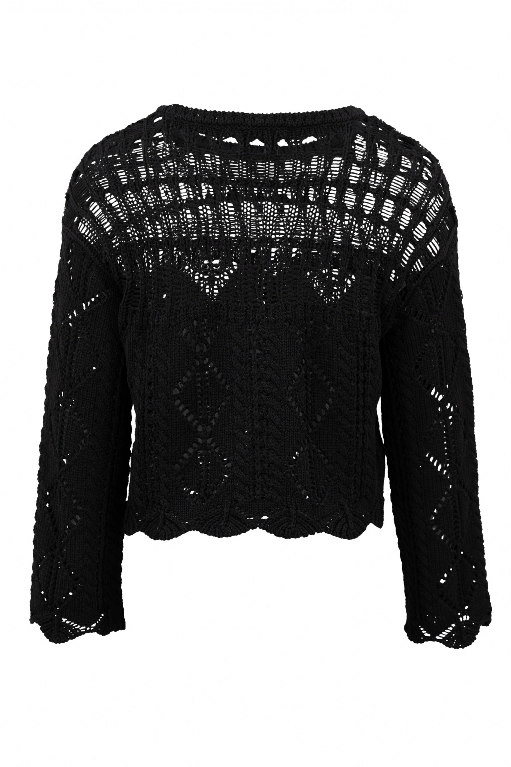 De Alaya gebreide trui is voorzien van een prachtig gebreid motief met opengewerkte details, wat een luchtig en vrouwelijke uitstraling geeft. De zwarte kleur is tijdloos en ideaal om te combineren met verschillende outfits. Met een brede ronde hals en flared lange mouwen biedt deze trui een elegante en modieuze look.