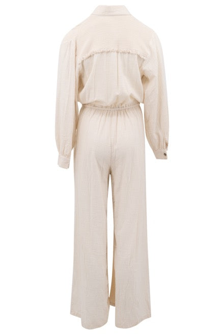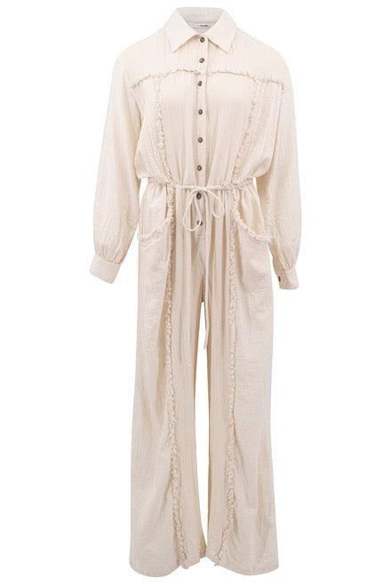 De Lio Jumpsuit straalt een ultieme Ibiza vibe uit en is een must-have voor een stijlvolle Boho- look. Gemaakt van 100% katoen, voelt deze jumpsuit heerlijk luchtig aan. De houten knopen en sierranden met franjes geven een speelse, zomerse uitstraling. De wijde broekspijpen zorgen voor een elegante flow, terwijl de taille strijkbaar is voor een flatterende pasvorm. Praktische steekzakken aan de zijkant maken deze jumpsuit niet alleen trendy, maar ook comfortabel. Draag met sandalen voor een casual Beach-look of combineer met hakken voor een avondje uit.