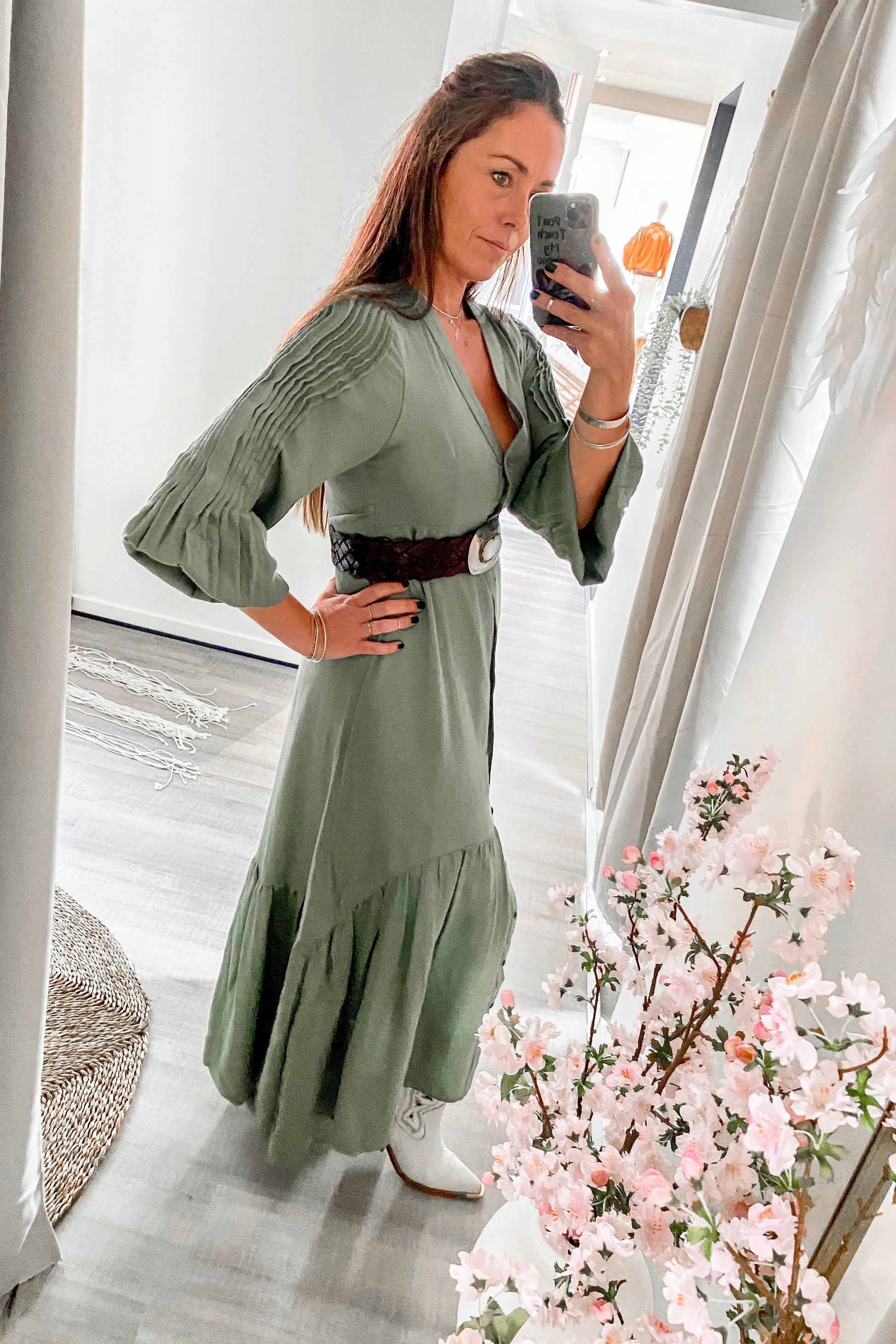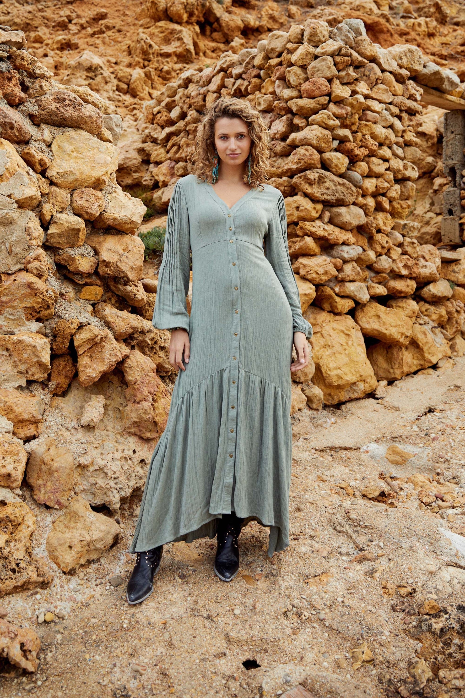 Deze lange jurk van Isla Ibiza in elegant grijs groene kleur is perfect voor een boho-chique look. De jurk heeft een v-hals uitsnijding en is afgewerkt met typische hartvormige knoopjes van boven tot onder om te stylen naar wens. De lange mouwen zijn voorzien van subtiele plooitjes als detail en een comfortabele elastische rand aan de pols. Dankzij het lint om te centreren creëer je eenvoudig een vrouwelijke pasvorm. De jurk valt iets langer achteraan voor een speelse look.