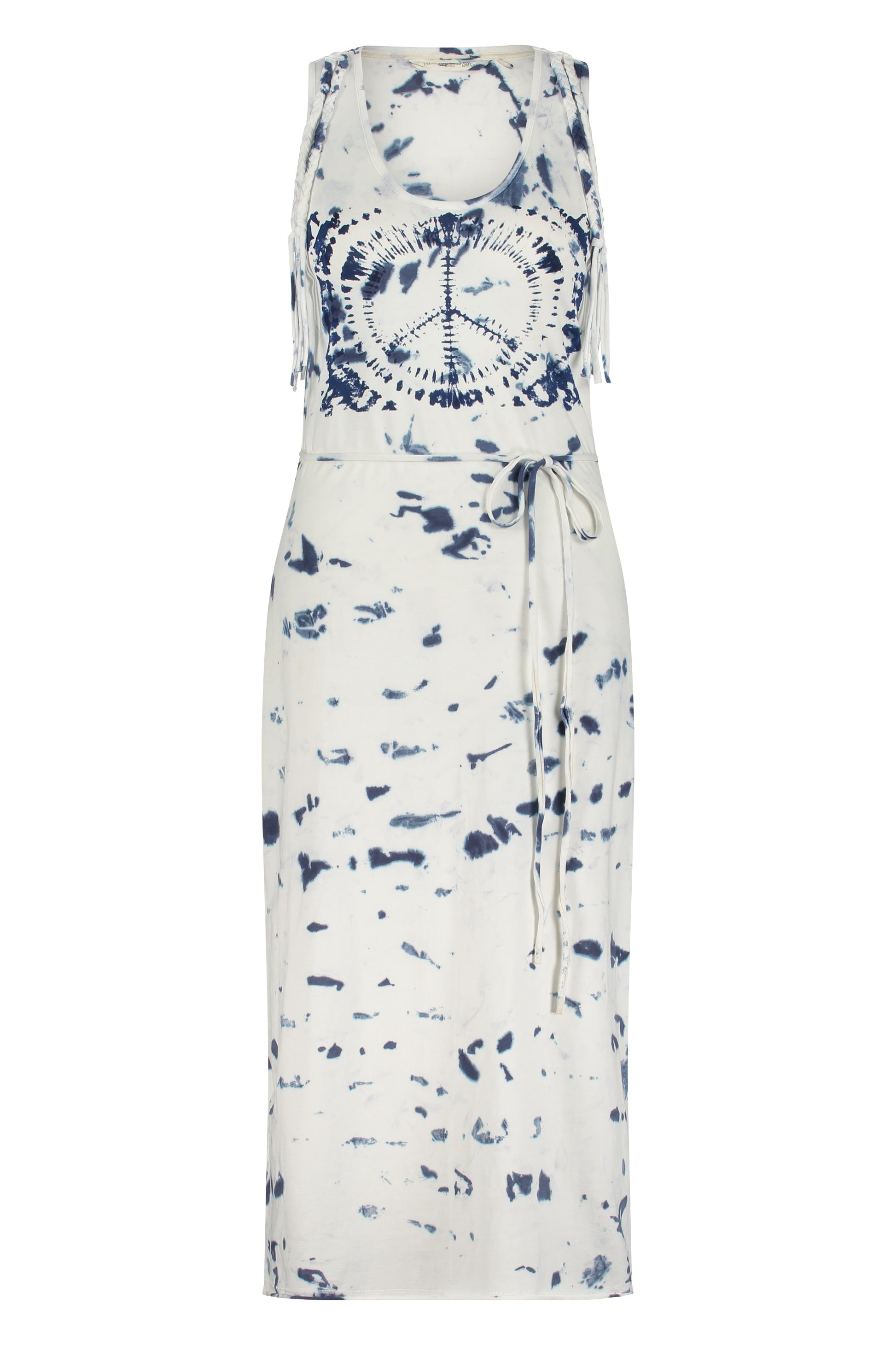 Voorzien van een blauwe tie-dye print en peace teken, is deze mouwloze witte jurk perfect voor warme dagen. Met gevlochten details aan de schouders en vervaardigd uit comfortabele t-shirt stof, combineert deze jurk een relaxte en trendy zomerlook!