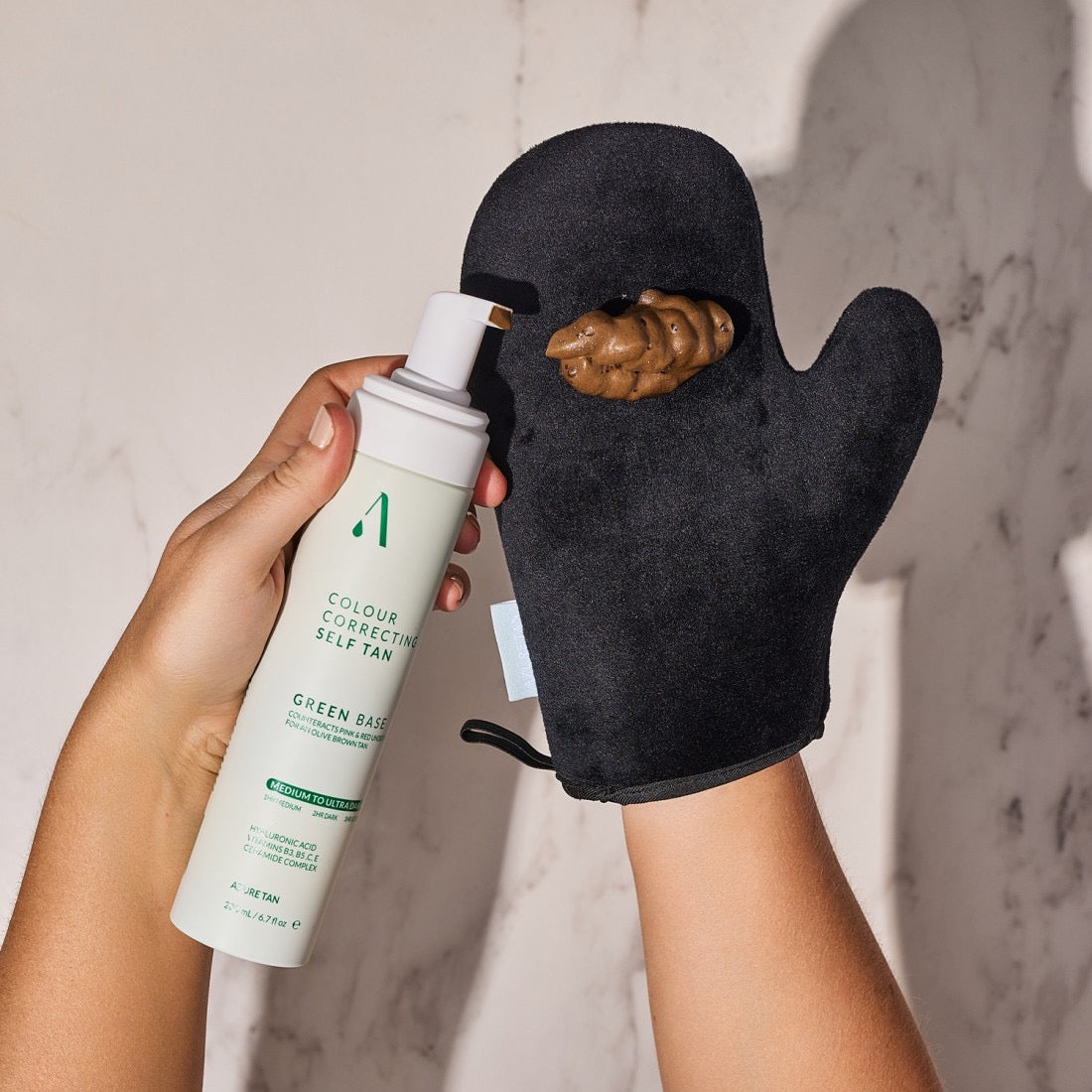 De Self Tan Mousses van AZURE TAN zijn verzorgende, kleurcorrigerende zelfbruiners. De GREEN BASE neutraliseert roze/ rode ondertonen voor een olijfbruine kleur.