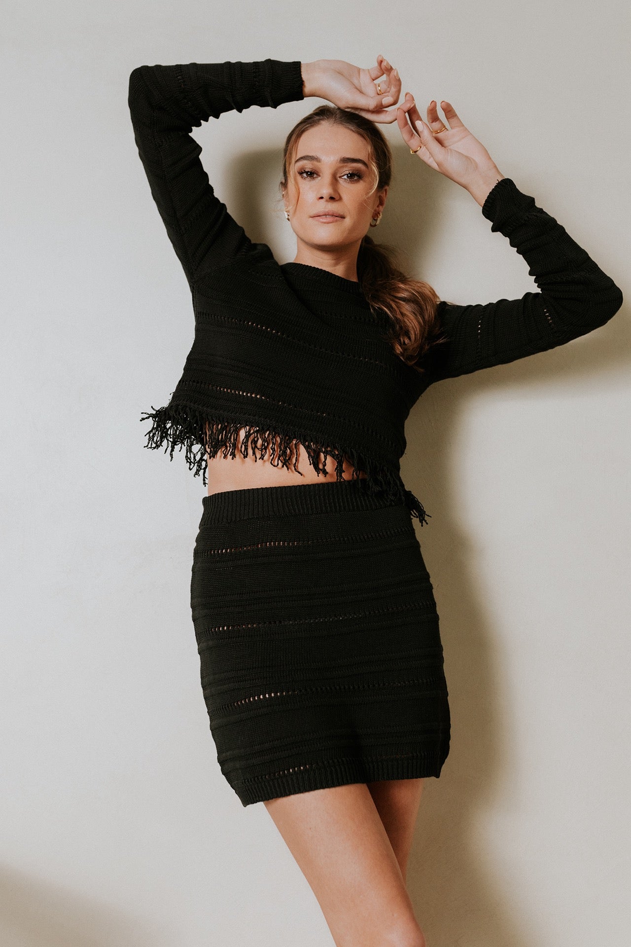 De Bloom Top, van het Belgische label Forty The Label, is een kort gebreide top met lange mouwen. De top heeft een ronde hals en is gebreid in een lineair patroon. Ookal is deze top cropped, de fringes onderaan de top zorgen voor meer bedekking. Draag deze de Bloom Skirt of Bliss Skirt om de look af te werken. Of met een hoge taille jeans, short of broek voor een coole look.