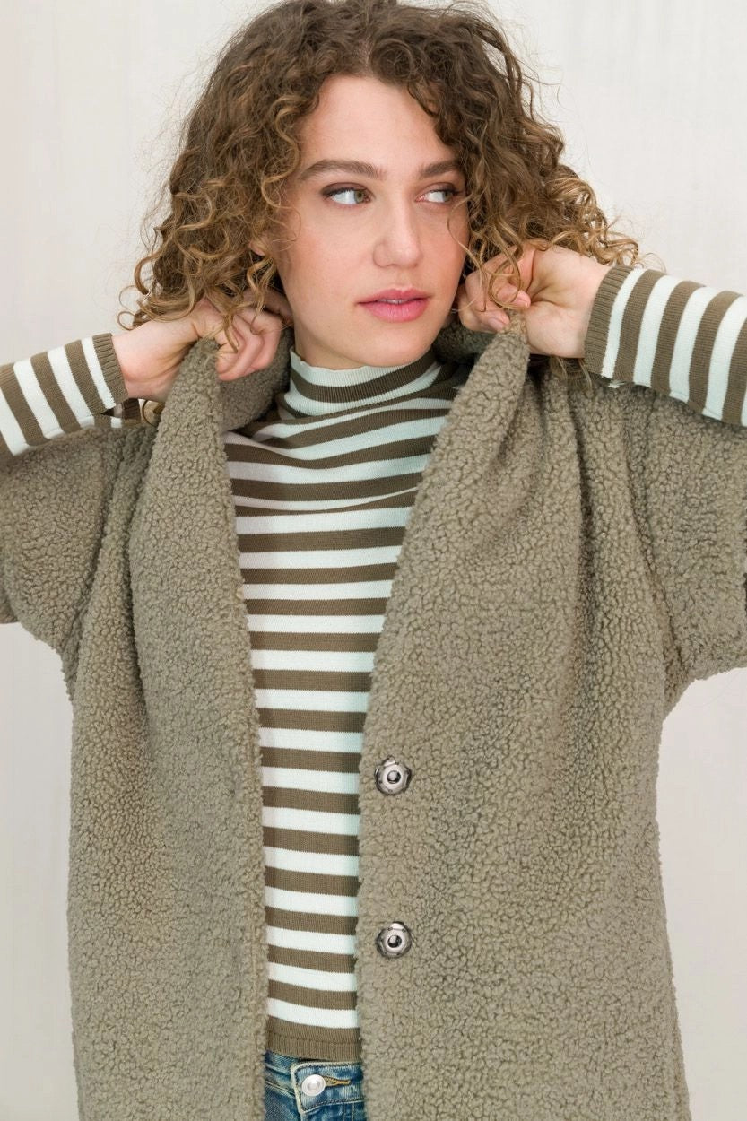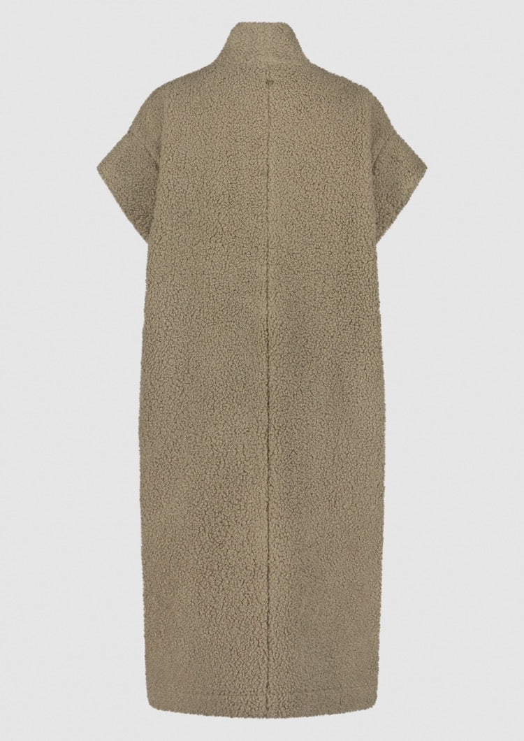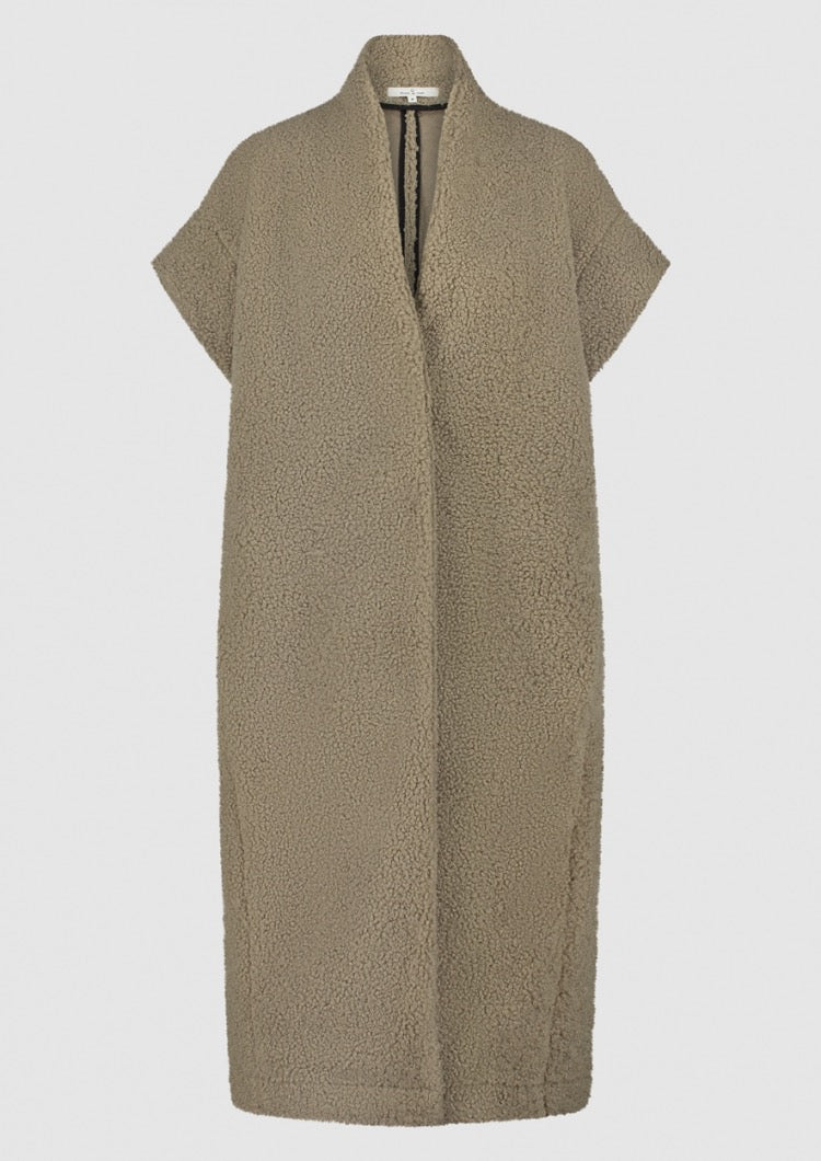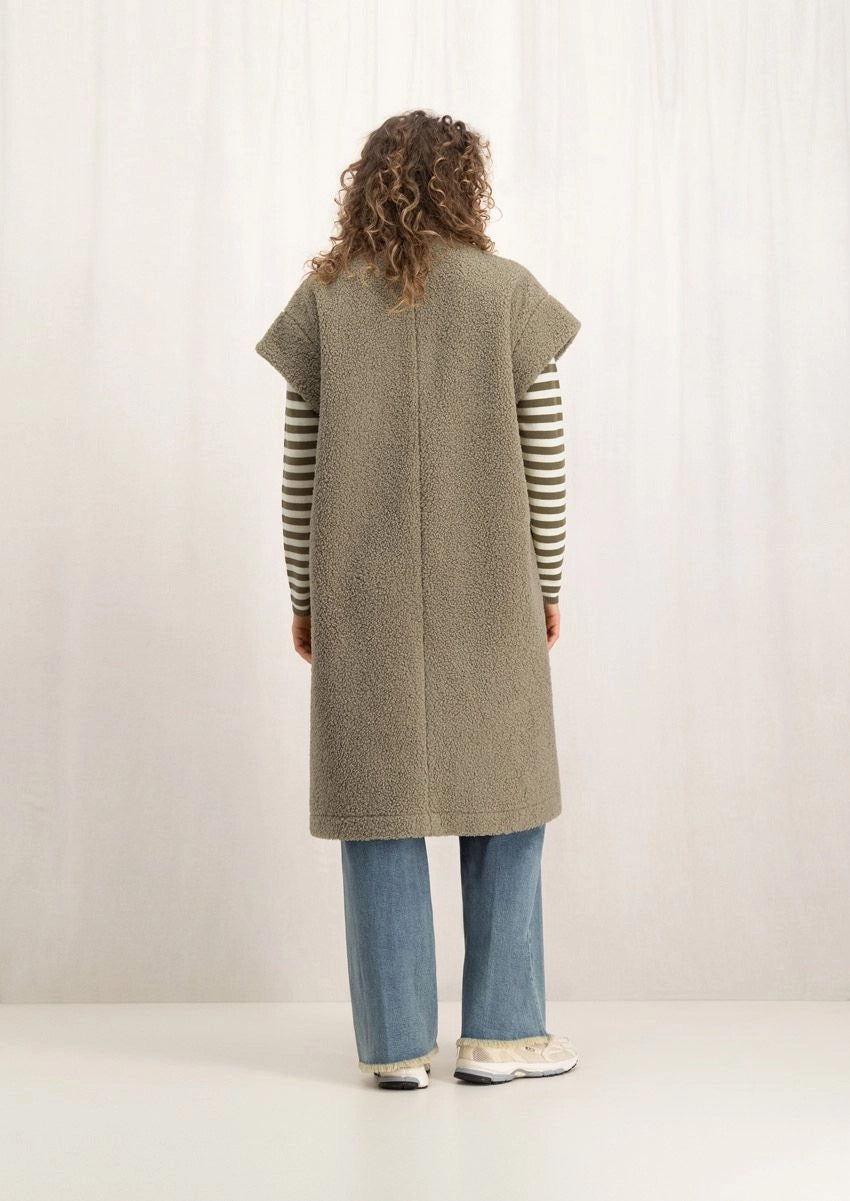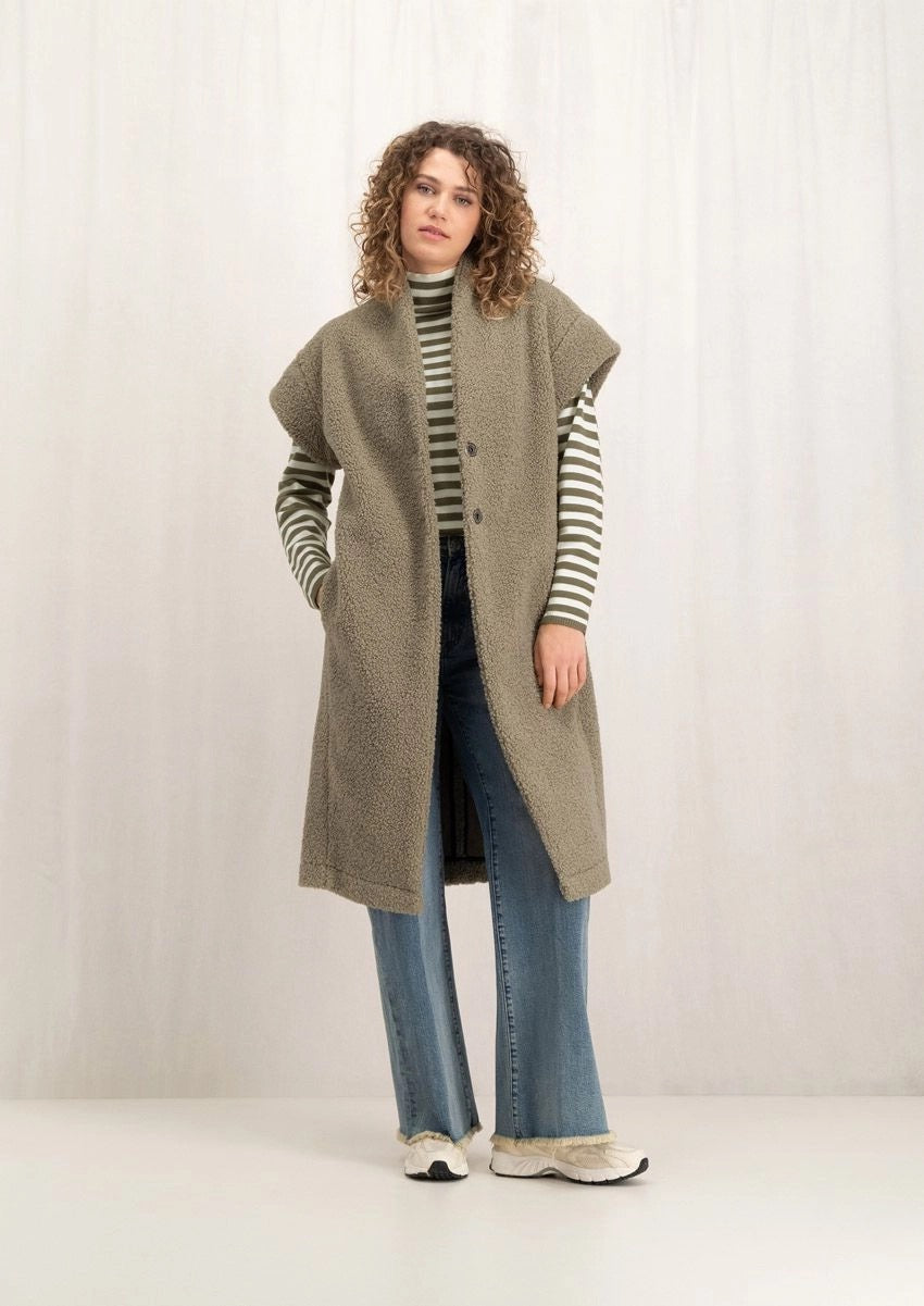 De Bo Gilet is een stijlvolle lange bodywarmer gemaakt van zachte teddy stof. Met zijn kaki tint, loose fit en praktische knoopsluiting, is deze mouwloze gilet perfect om elke outfit een cozy touch te geven. Ideaal voor layering tijdens koudere dagen.