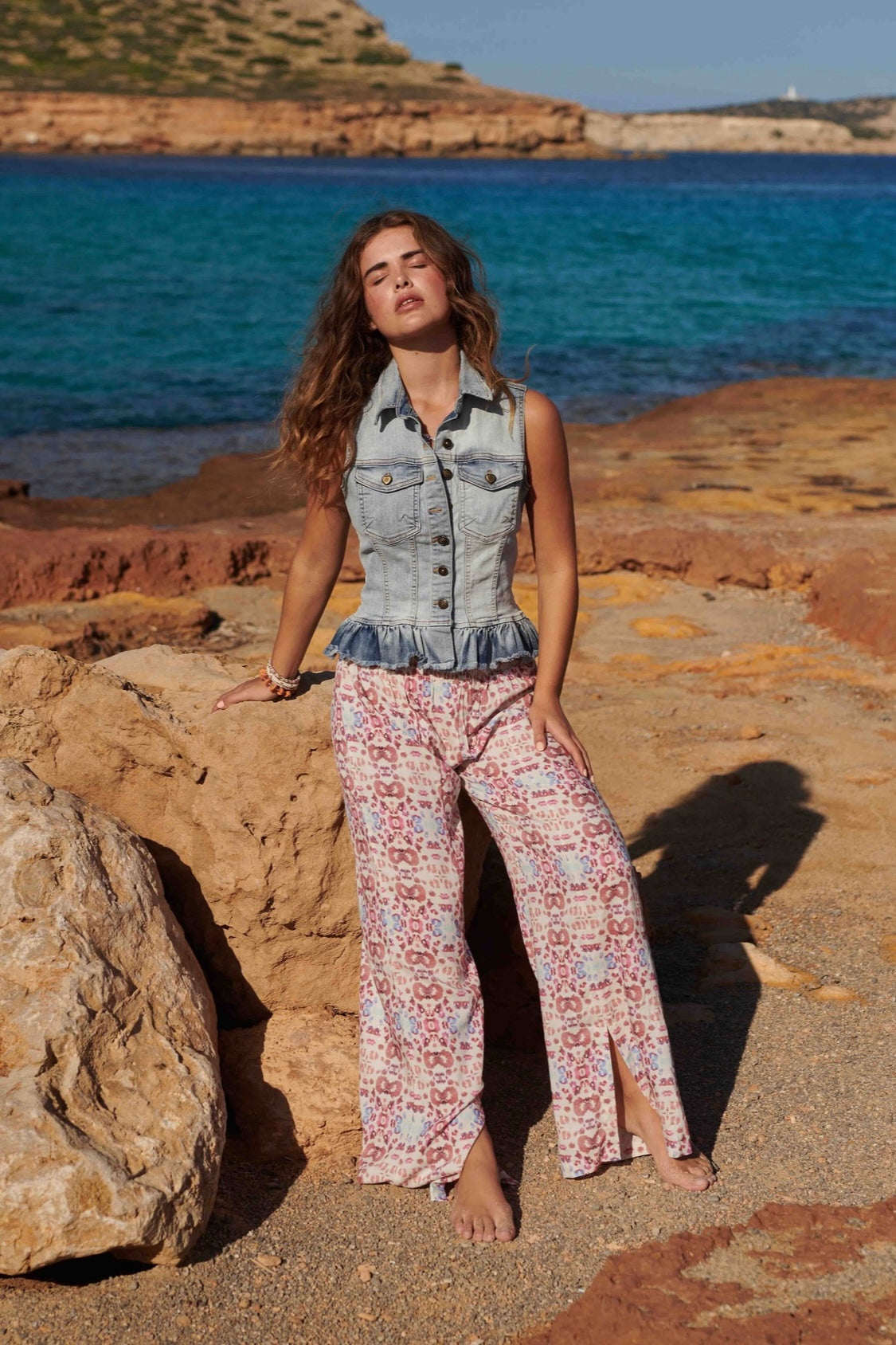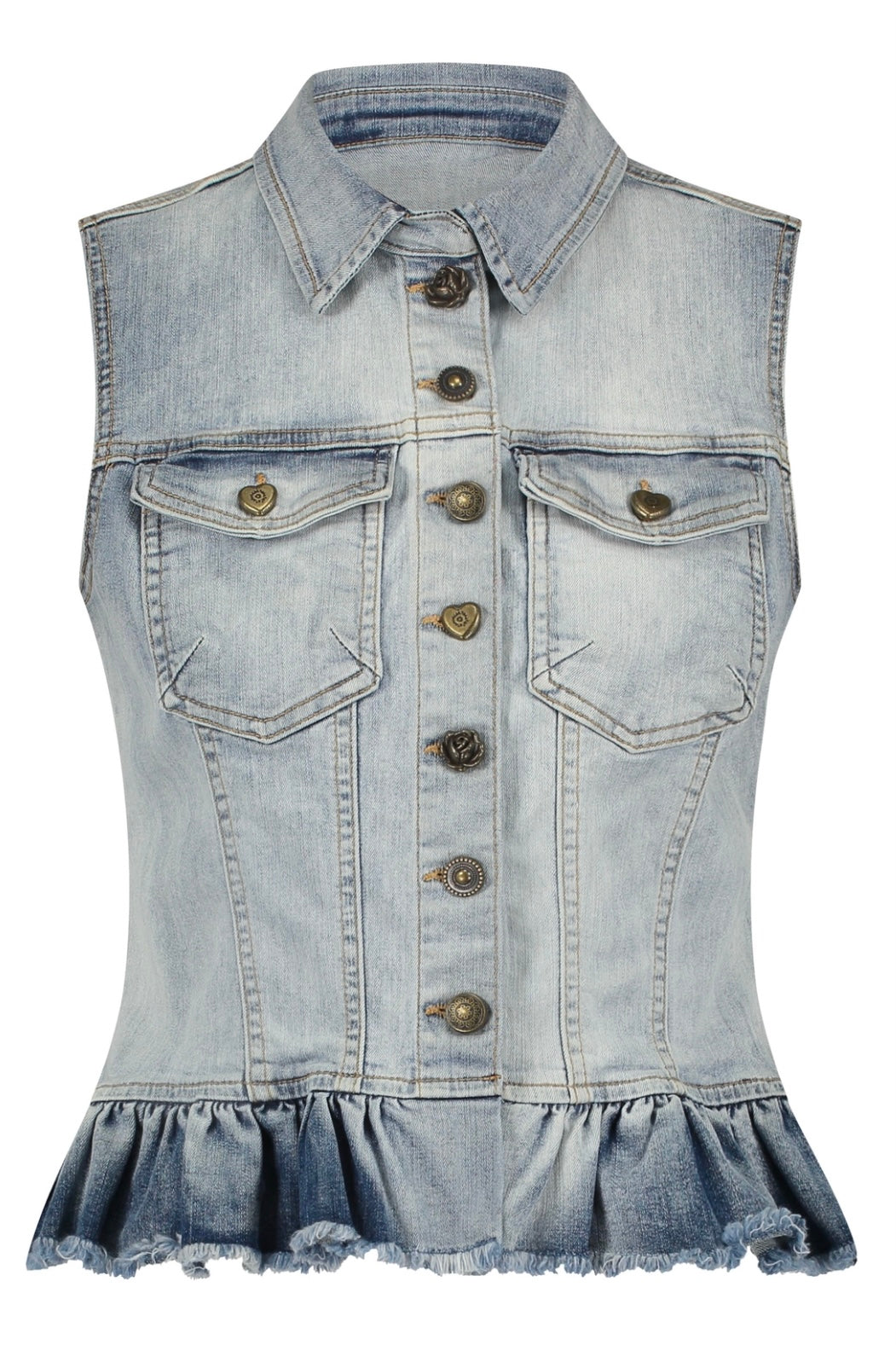De Denim Gilet Ruffled is een spijkergilet met een vrouwelijke touch. Dit mouwloze gilet heeft een klassieke maar unieke knoopsluiting, een getailleerde pasvorm en stoere details gecombineerd met een speelse ruches boord aan de onderkant. De vintage wassing maakt het een echte must-have voor je denim collectie. Gemaakt van hoogwaardig katoen met een vleugje stretch voor optimaal comfort. Perfect om te dragen als top of over een blouse, t-shirt of jurk voor een trendy gelaagde look.