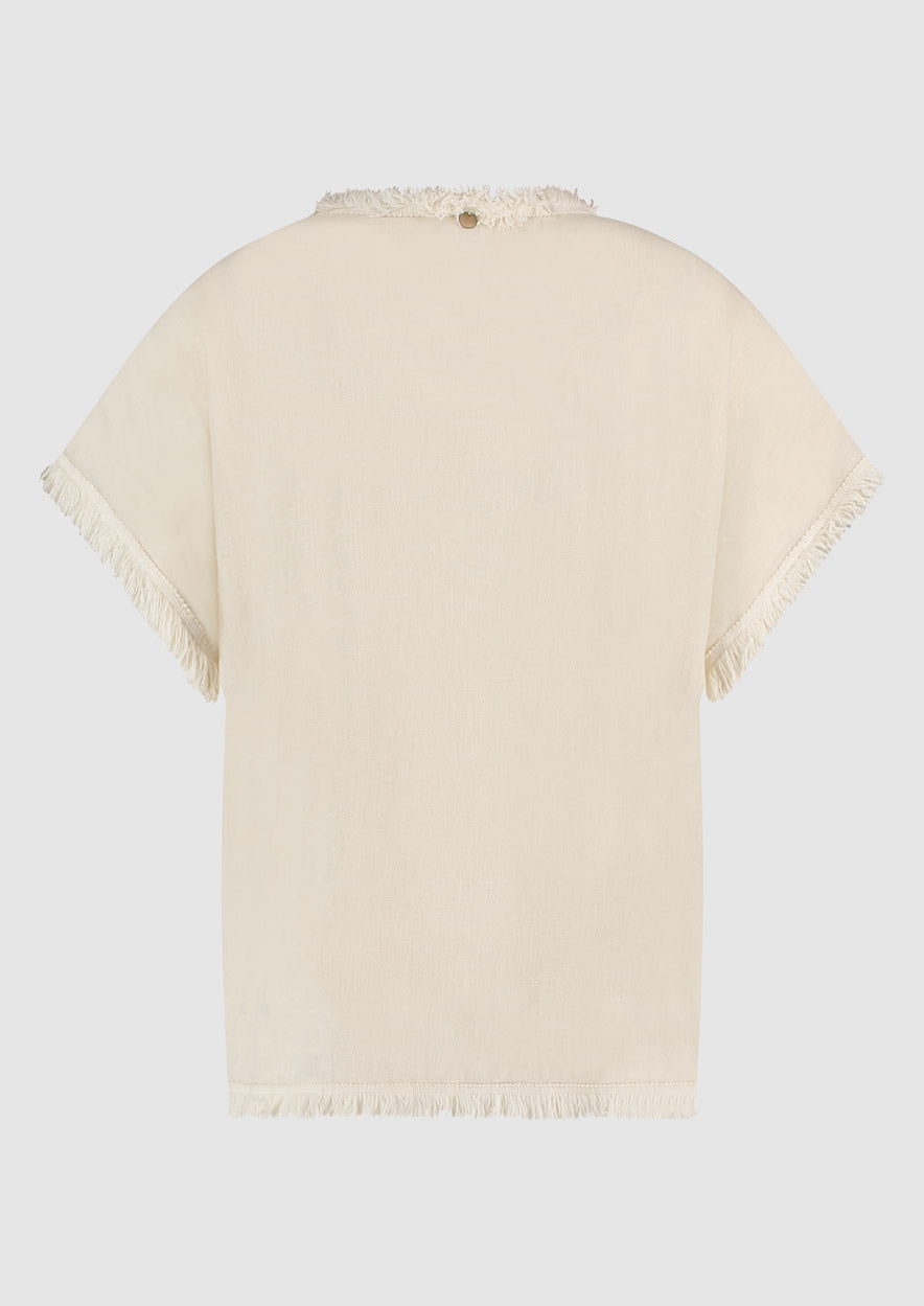 Deze Elvira dames top van Circle Of Trust biedt een loshalende losse fit, perfect voor ontspannen mar toch stijlvolle look. Gemaakt van 100% linnen, biedt deze blouse een lichtgewicht en ademende ervaring, ideaal voor warme dagen. De Elvira Blouse is voorzien van knoopsluitingen en gerafelde boorden, waardoor het een speelse en verfijnd karakter krijgt. De Antique White kleur, een licht beige tint, voegt een tijdloze en veelzijdige uitstraling toe.