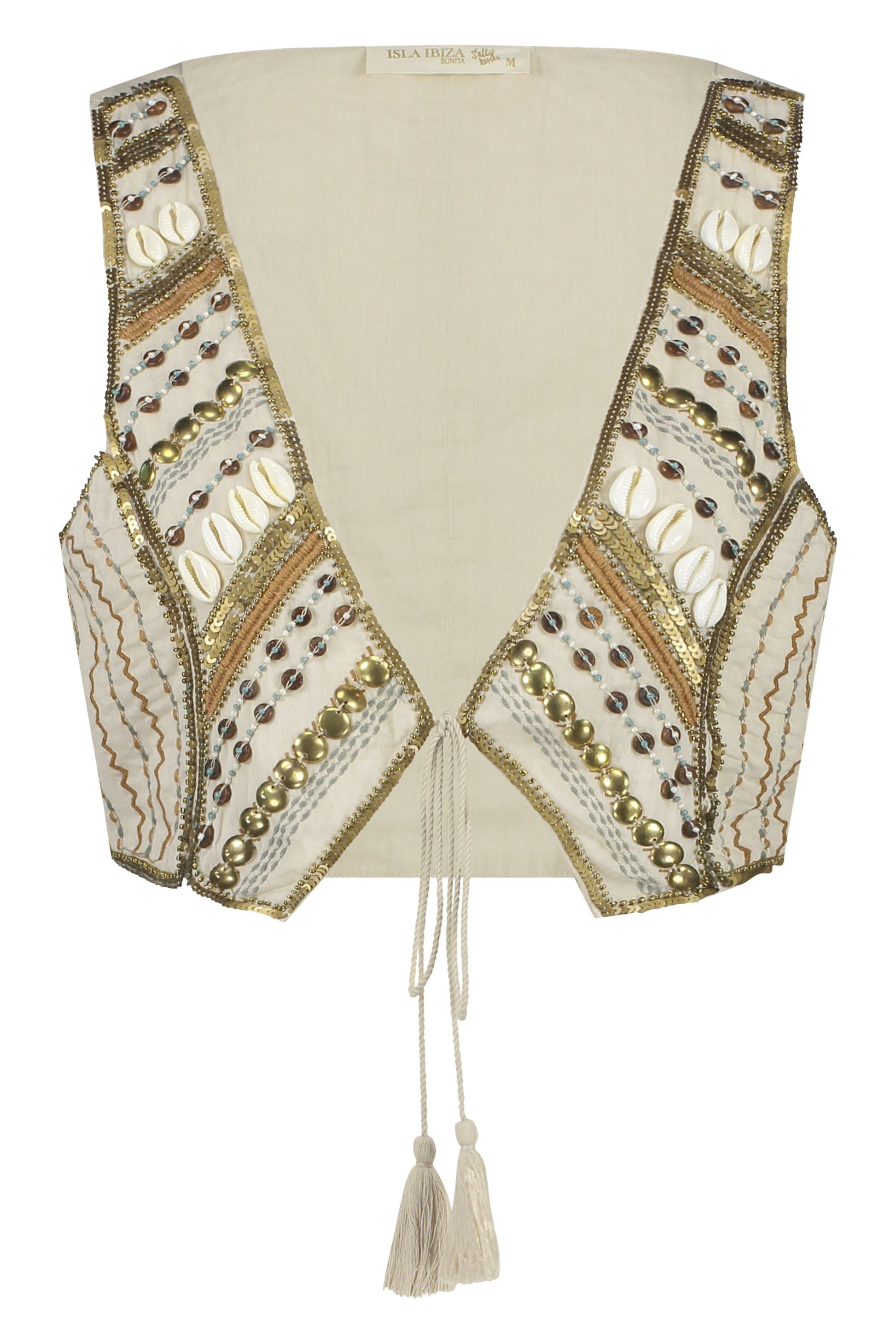 De Fiesta Gilet is een unieke korte debardeur in een zachte crème kleur. Voorzien van prachtige schelpjes en kraaltjes op de voorkant, straalt dit giletje pure Boho-stijl uit. De gilet kan vooraan gestrikt worden, achterkant is deze van effen katoen. Draag het over een hemd voor een elegante touch of als top voor een zomerse look!
