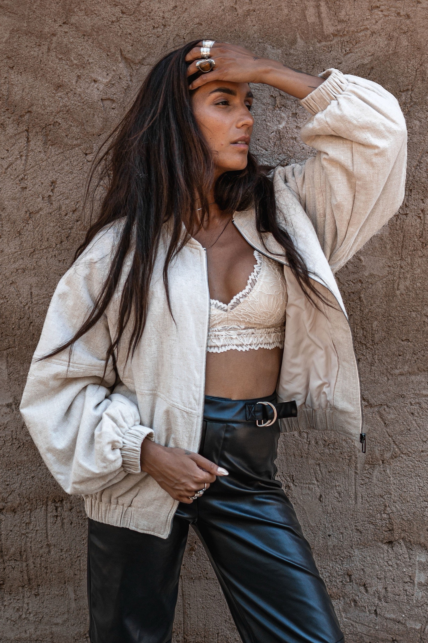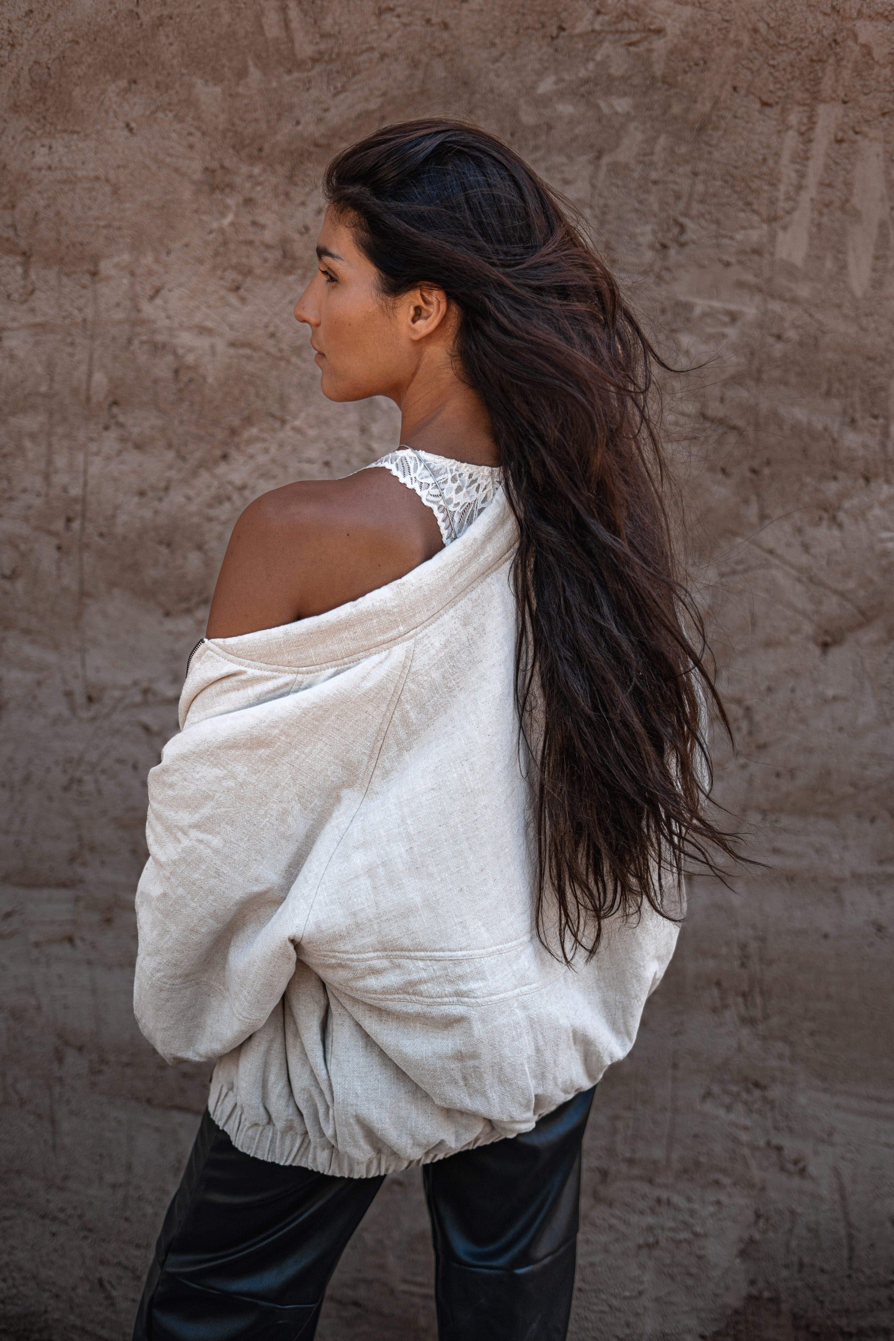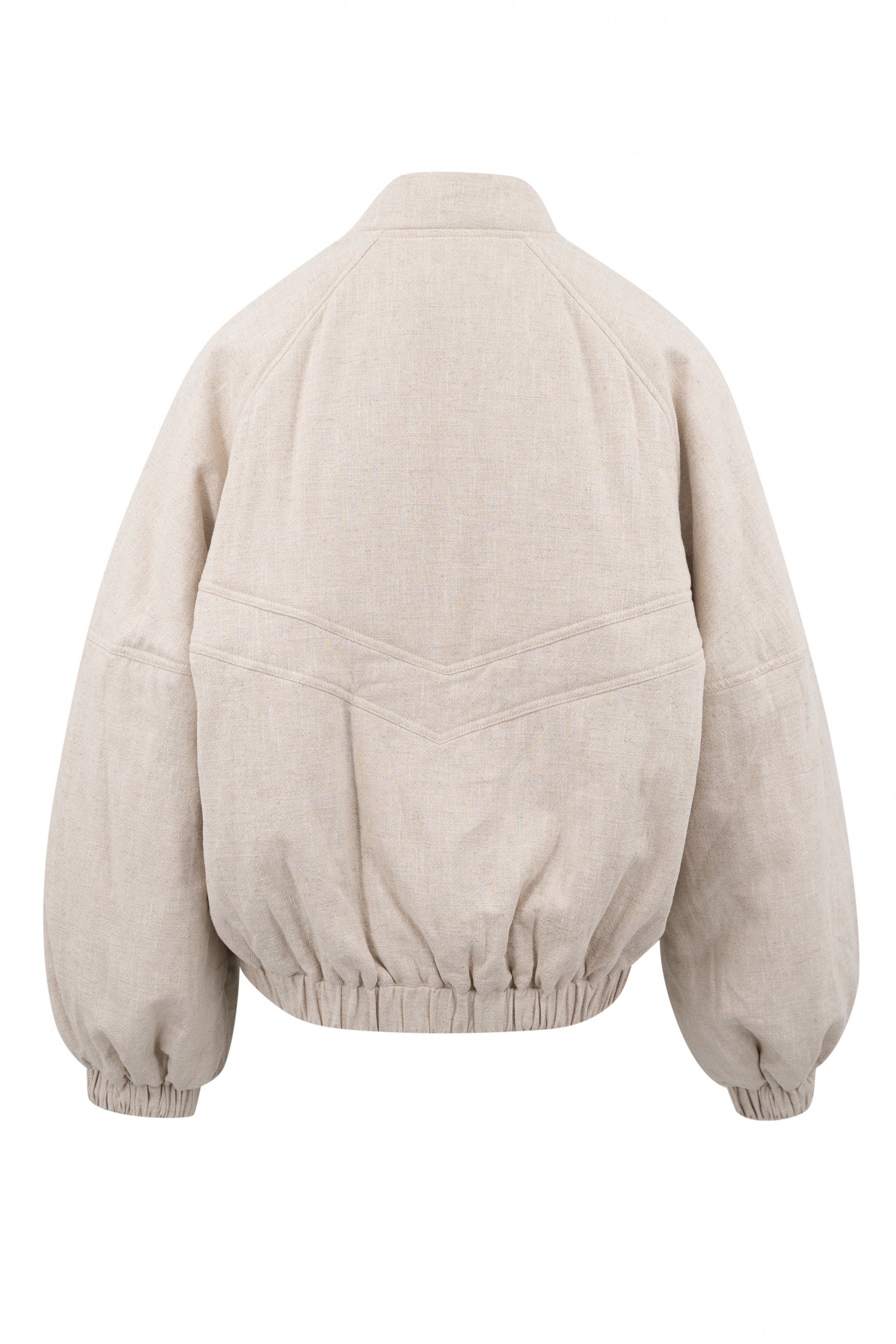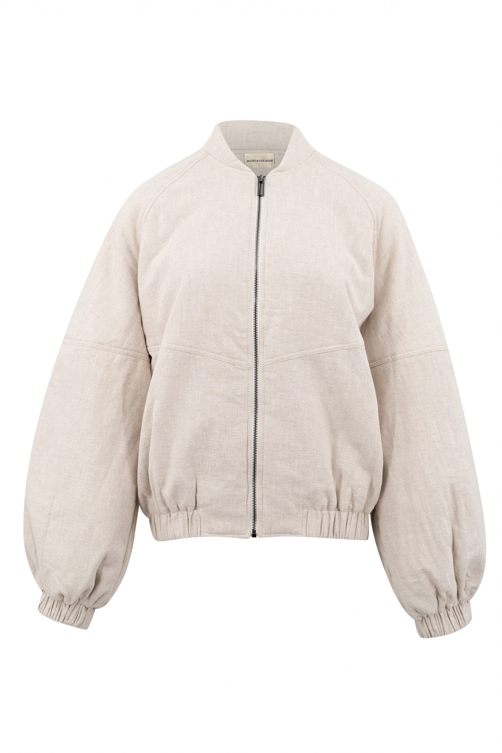 Stijlvol en tijdloos bomber jacket van 60% linnen en 40% katoen in een elegante beige melange kleur. Voorzien van een ritssluiting, elastische banden onderaan en aan de mouwen voor een perfecte pasvorm, en praktische insteekzakken. Lichtgewicht, ademend en veelzijdig. Perfect voor elke gelegenheid in elk seizoen.