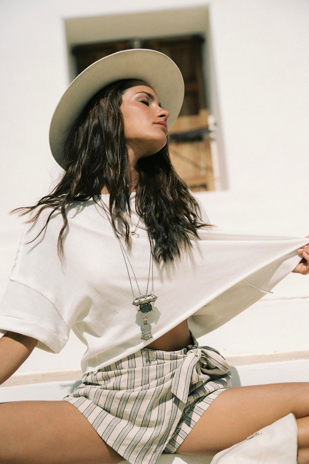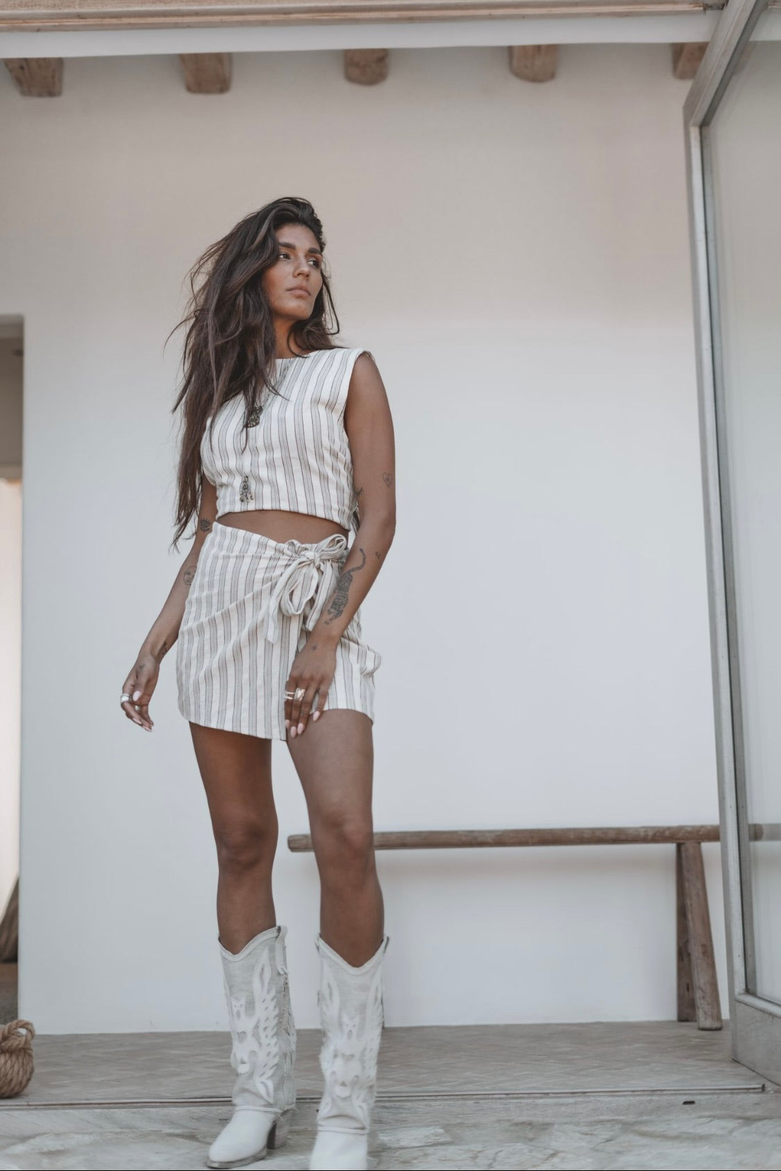 Combineer stijl en comfort met de Ivy Striped Skort! Deze unieke skort lijkt vooraan op een rok dankzij de stijlvolle overslag, maar biedt het gemak van een short. De luchtige, gestreepte stof in wit en grijs zorgt voor een frisse en zomerse uitstraling.