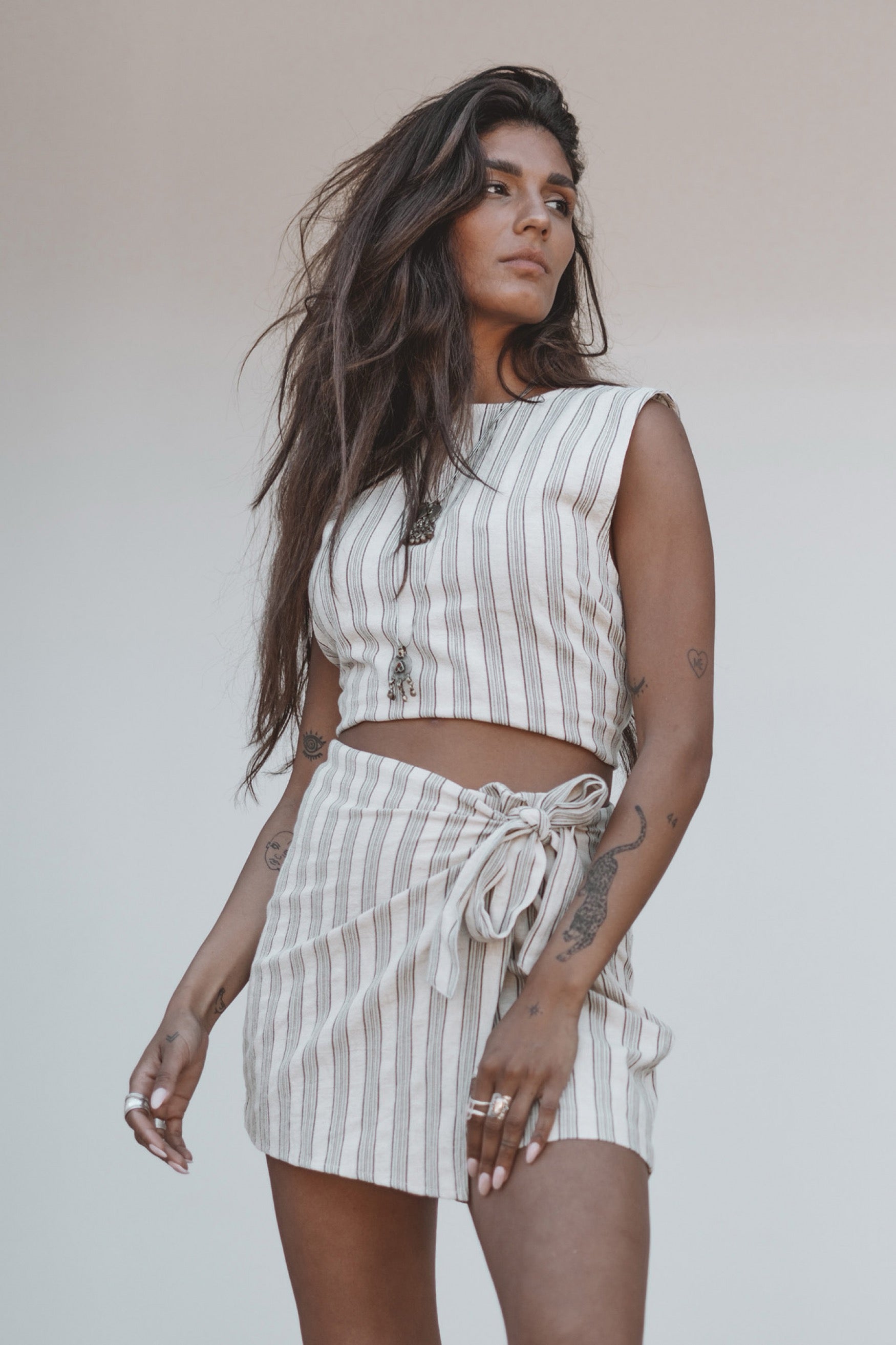 De Ivy Top heeft een elegante ronde hals en sluit met knoopje in de nek. Het opvallende strikdetail op de rug zorgt voor een speelse twist en laat de top open vallen op de rug voor een subtiele, sexy uitstraling. Het korte model maakt deze top perfect te combineren met de bijpassende Ivy Striped Skort voor een complete en chique outfit.