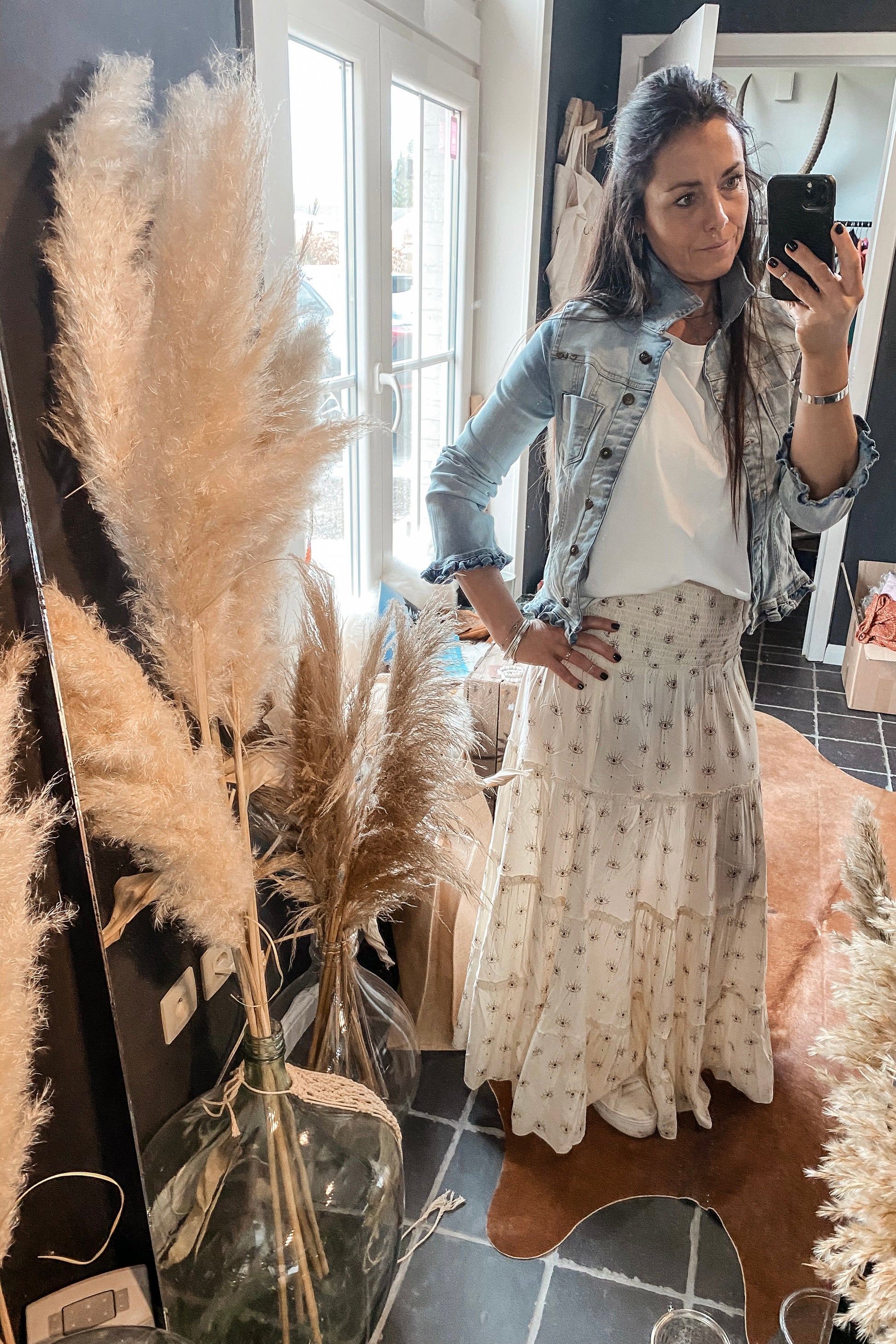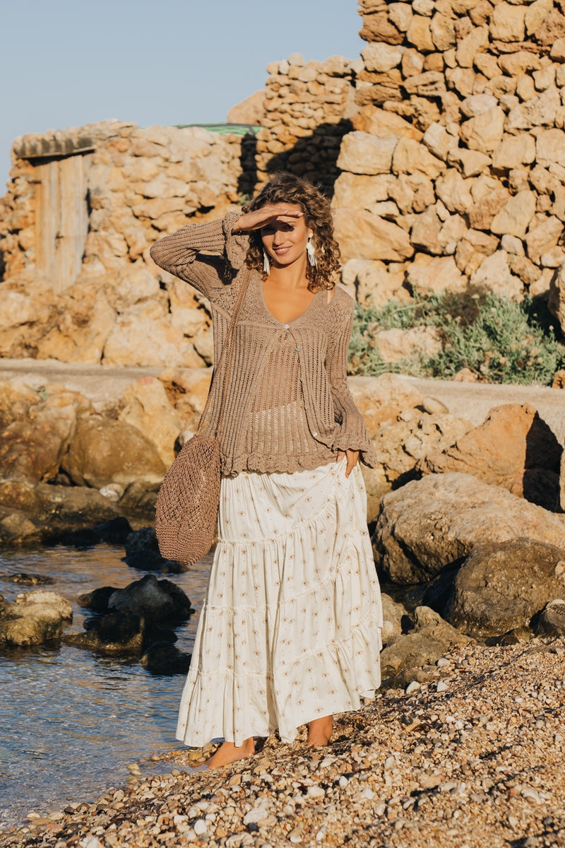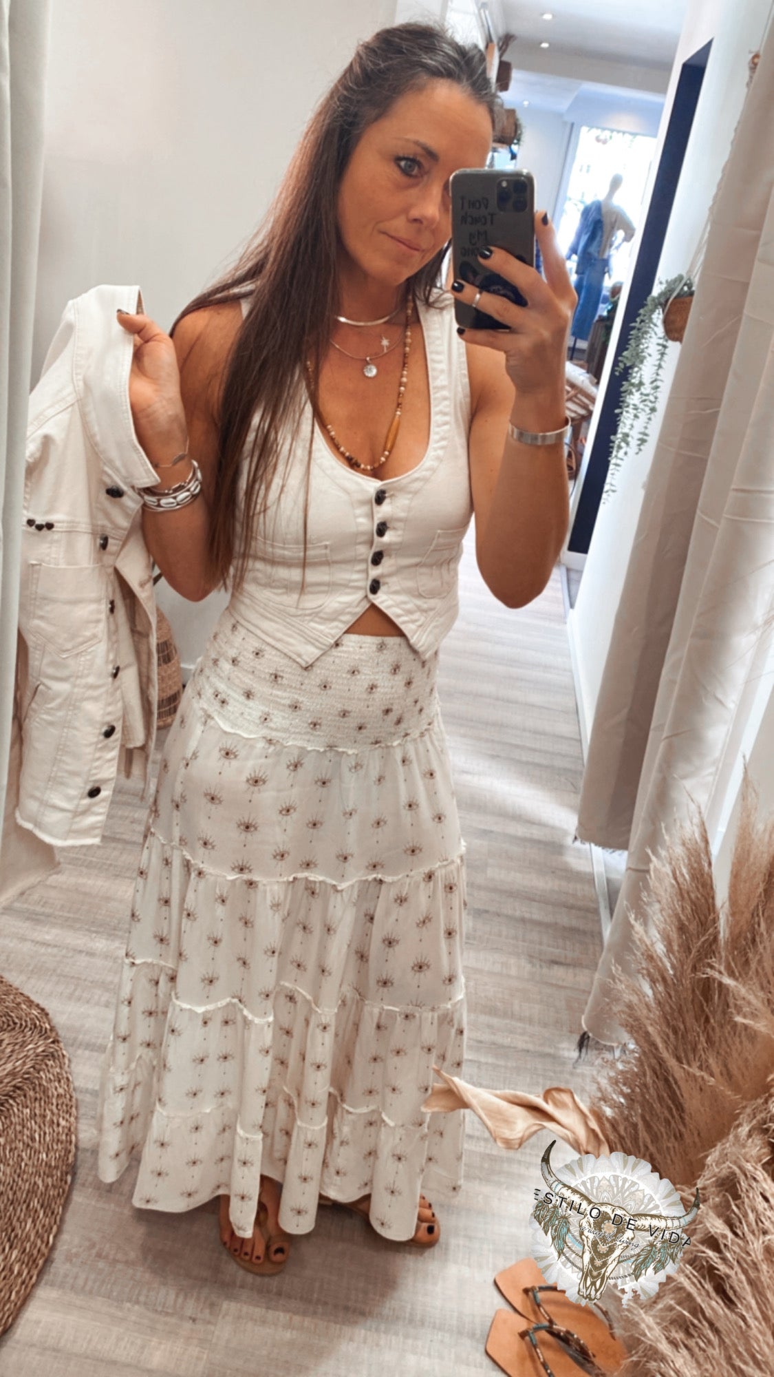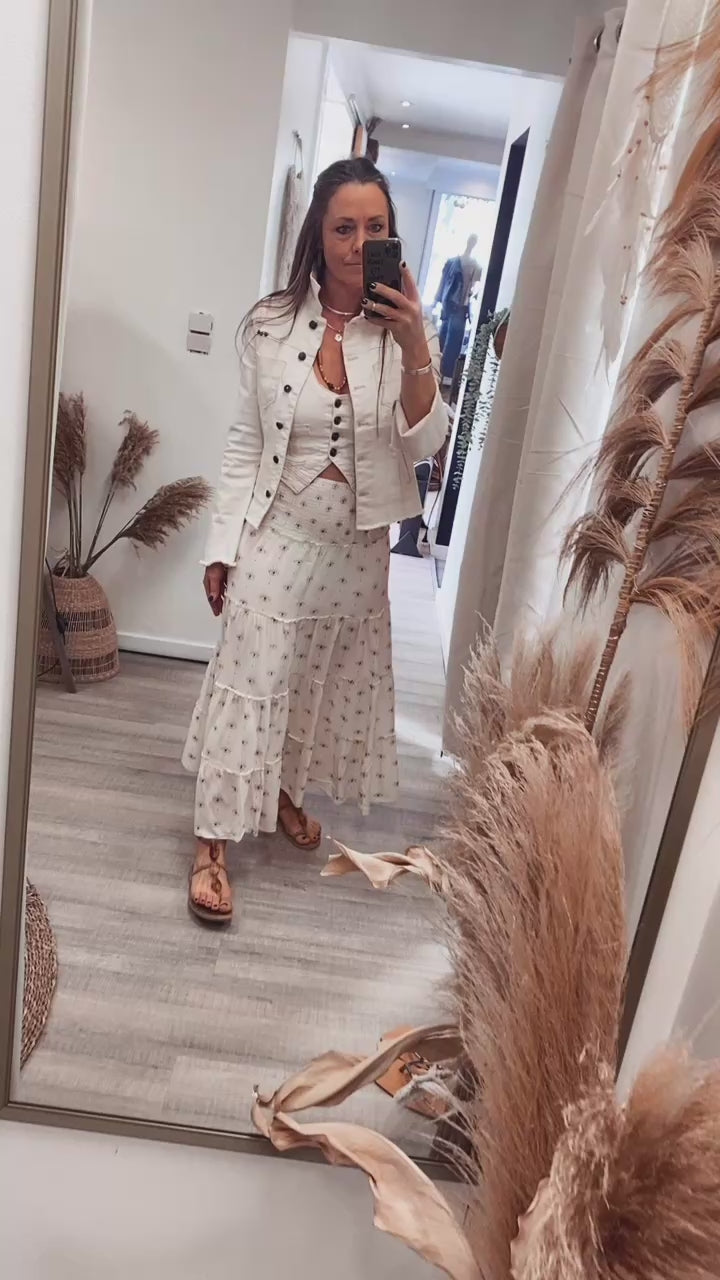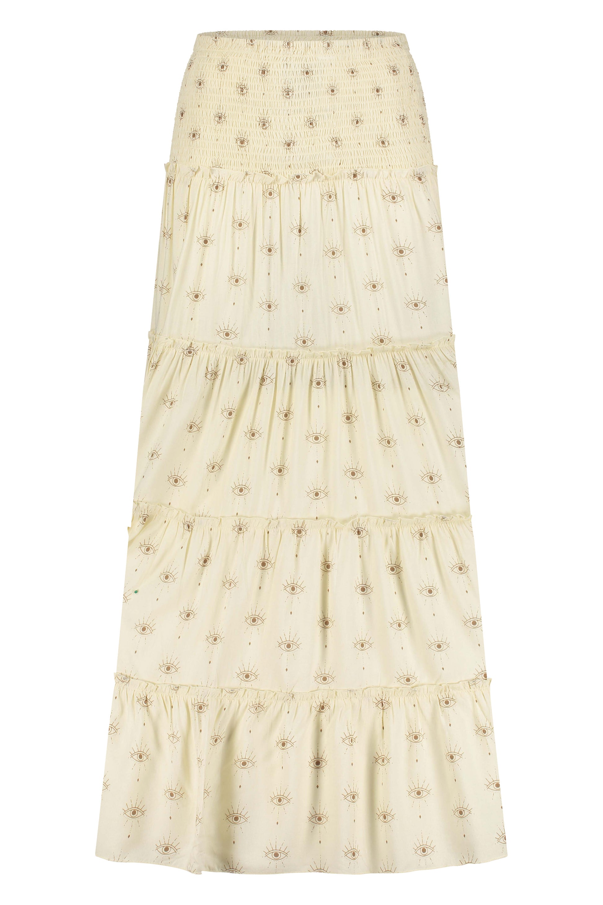 Ontdek de veelzijdigheid van de Isla Ibiza Golden Eye lange rok. Deze crèmekleurige maxi rok is voorzien van een trendy beige print in een patroon van oogjes en een comfortabele elastische tailleband. Met zijn unieke ontwerp kan deze rok ook moeiteloos als bandeau jurk worden gedragen.