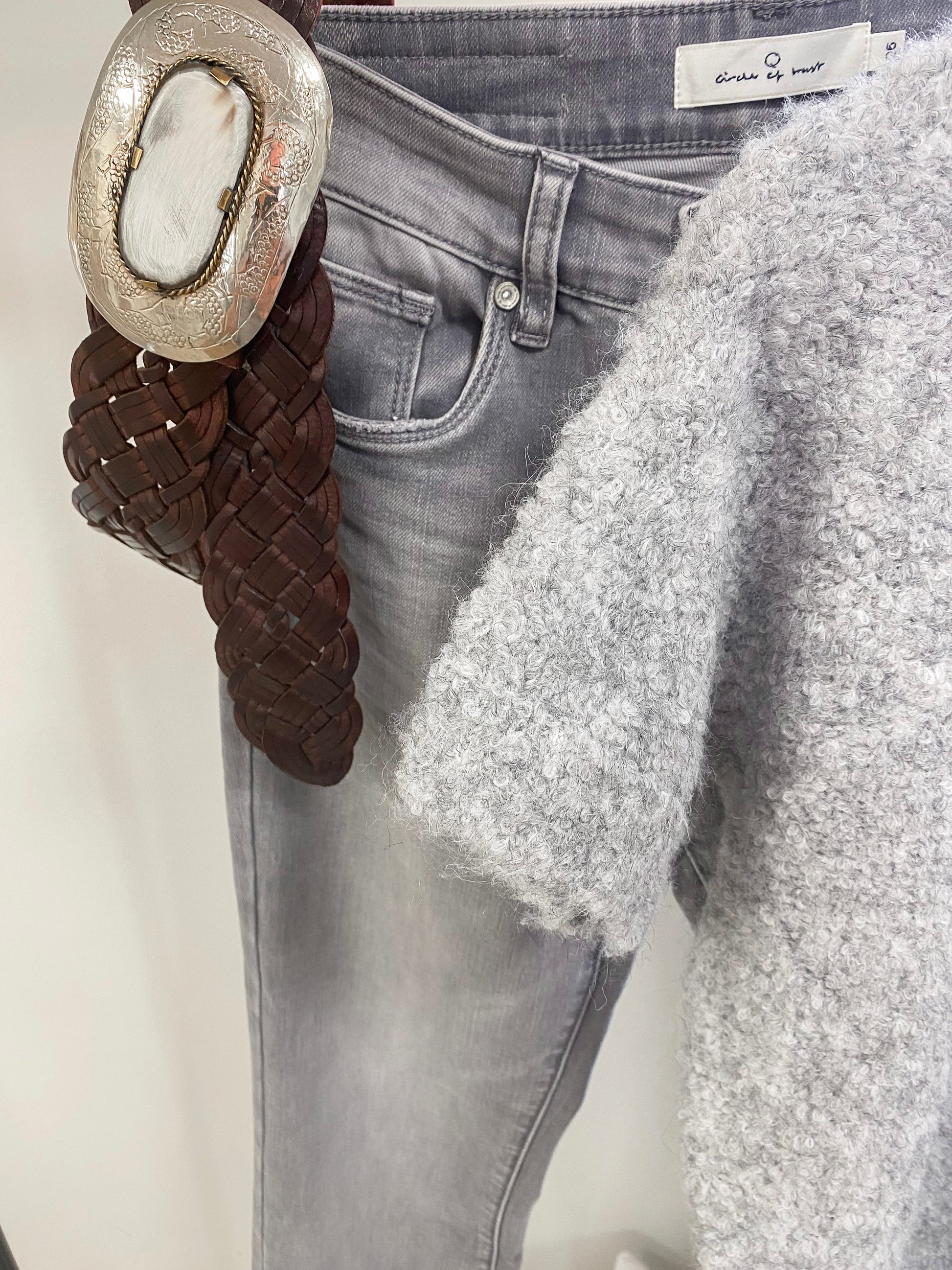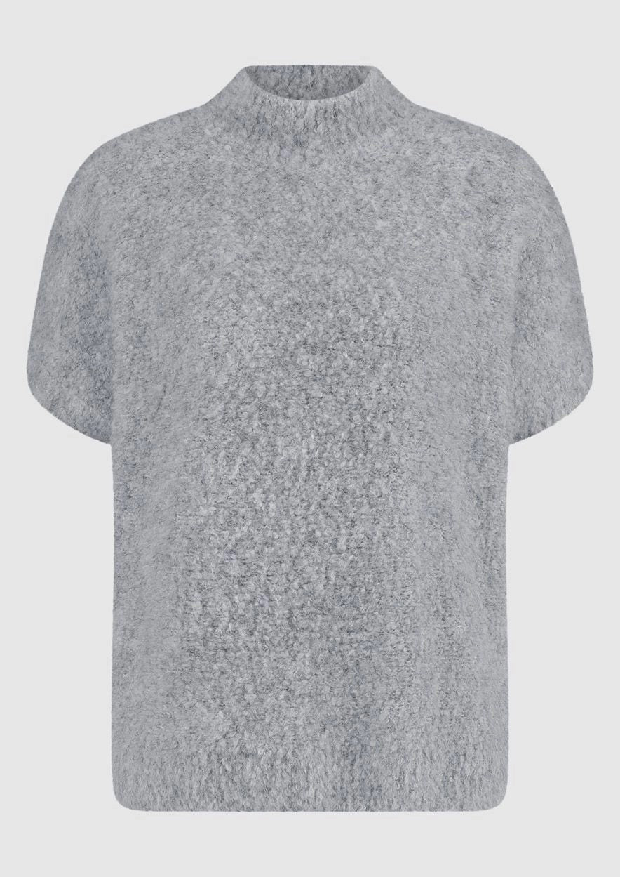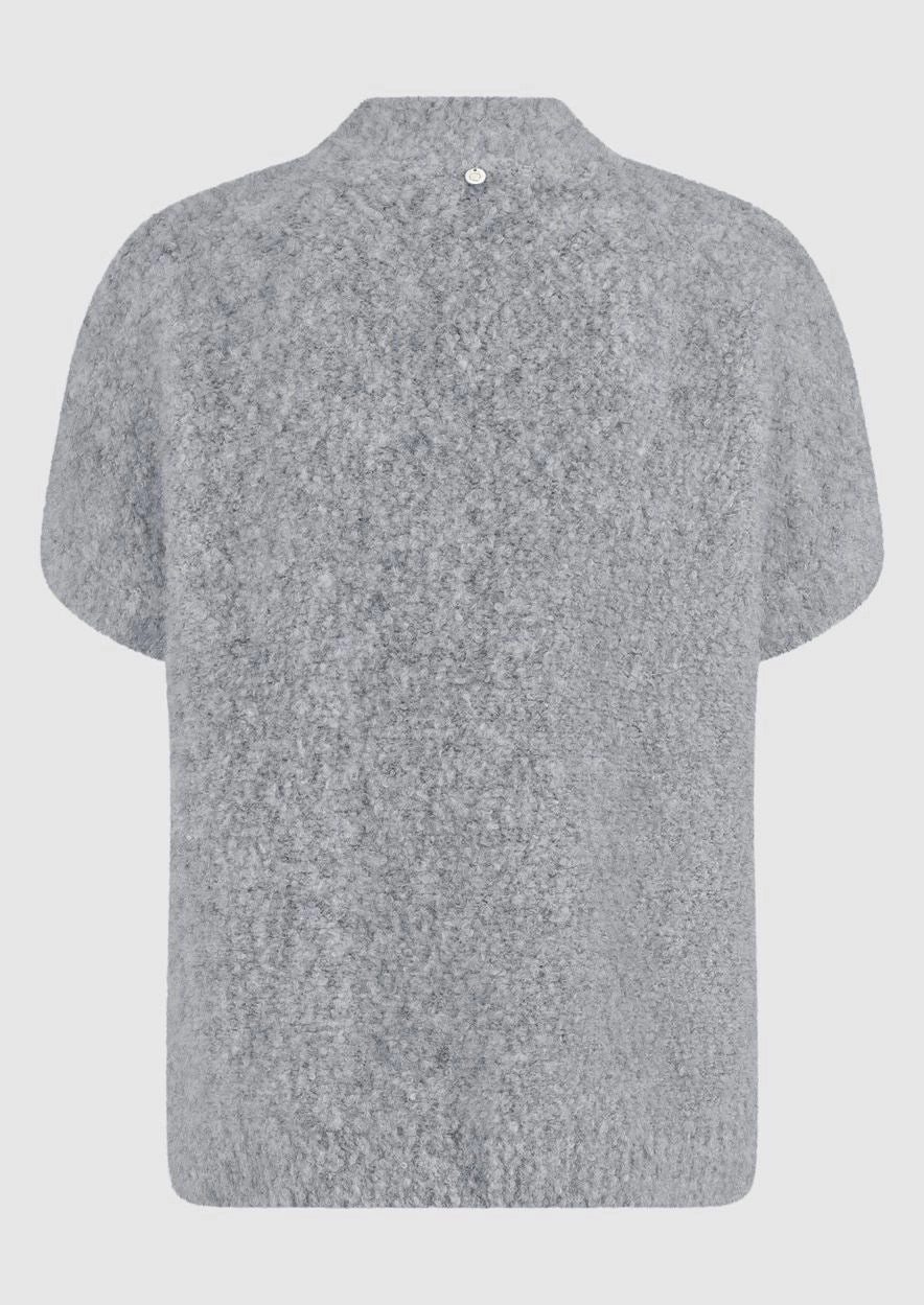 De Lena Knit Light Grey - een lichtgrijze, gebreide damestrui met korte mouwen, subtiele colkraag en oversized fit. Perfect voor een chique en comfortabele warme gelaagde look!