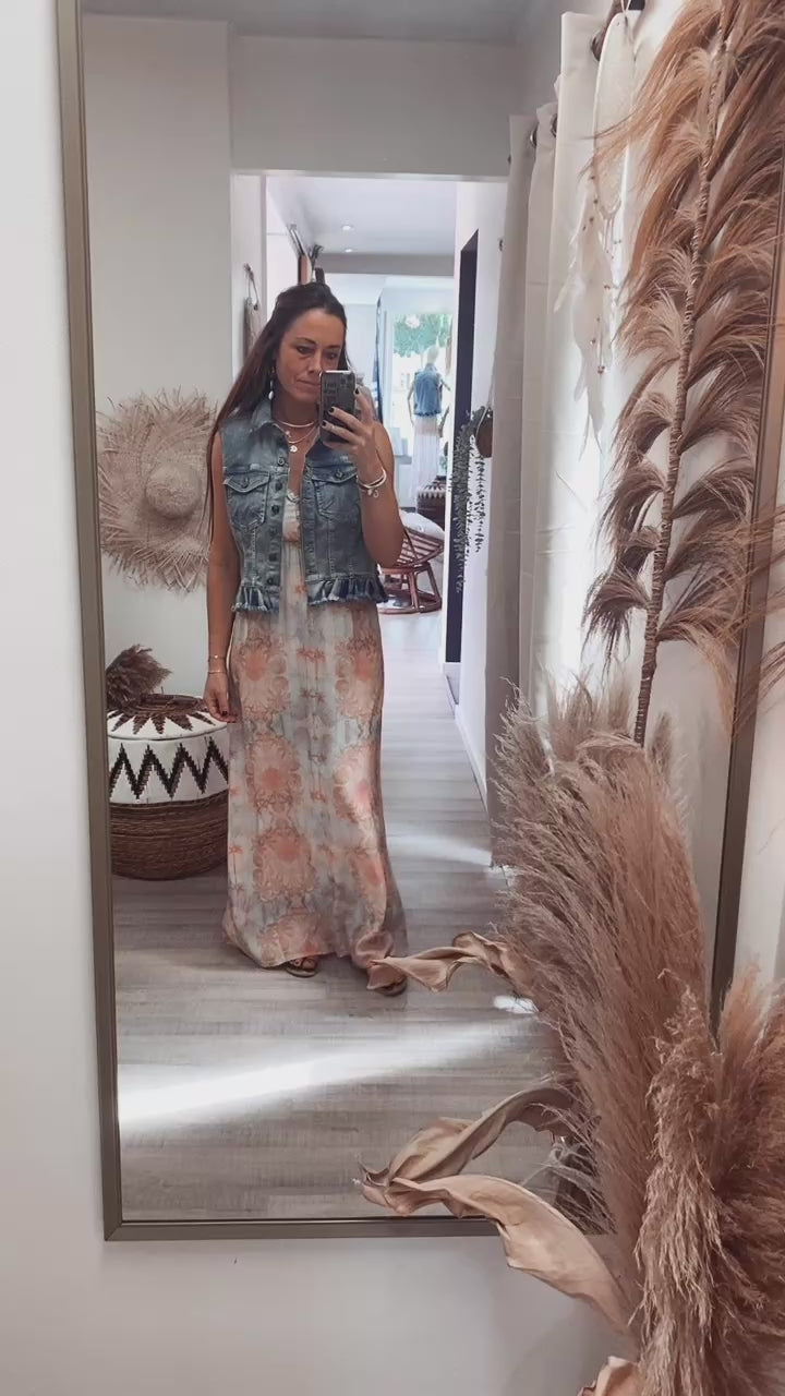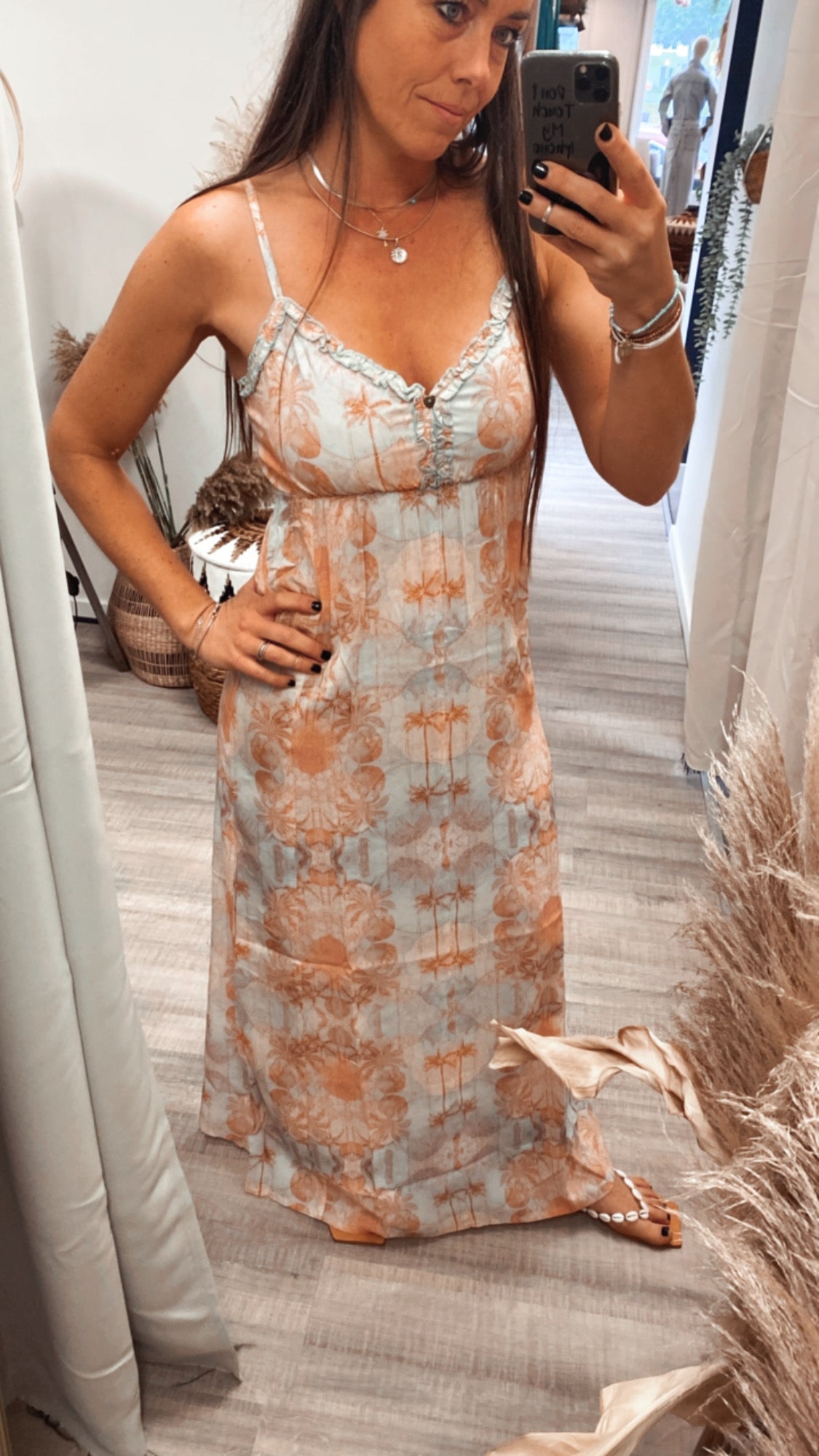 De Tropical Sunset Dress van Isla Ibiza Bonita is de jurk voor zwoele zomerdagen. Deze luchtige maxi-jurk heeft een vrouwelijke pasvorm met verstelbare spaghettibandjes, een zachte v-hals met ruches en een romantische tropical all-over print in warme tinten van sunset oranje, roze en lichtblauw.