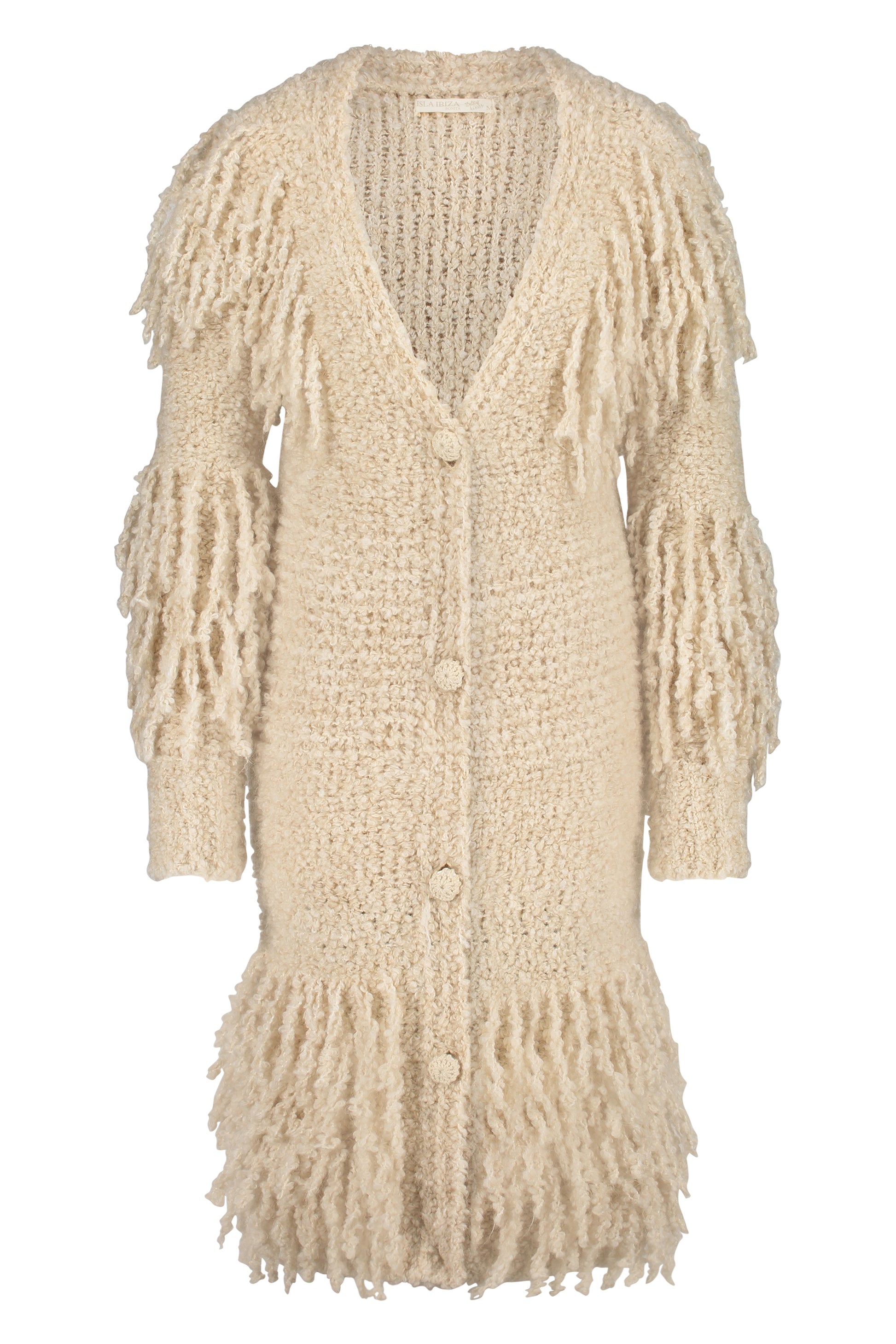 De Corazon Cardigan van Isla Ibiza bonita is een lange gebreide cardigan in een crèmekleurige tint. Hij is vervaardigd uit een mix van Acryl, Mohair en Lana wol, wat zorgt voor een zacht en warm gevoel. De bohemian cardigan heeft franjes langs de mouwen, schouders en aan de onderkant. de aansluitende mouwen en grote knopen voegen een charmant accent toe aan dit kledingstuk.