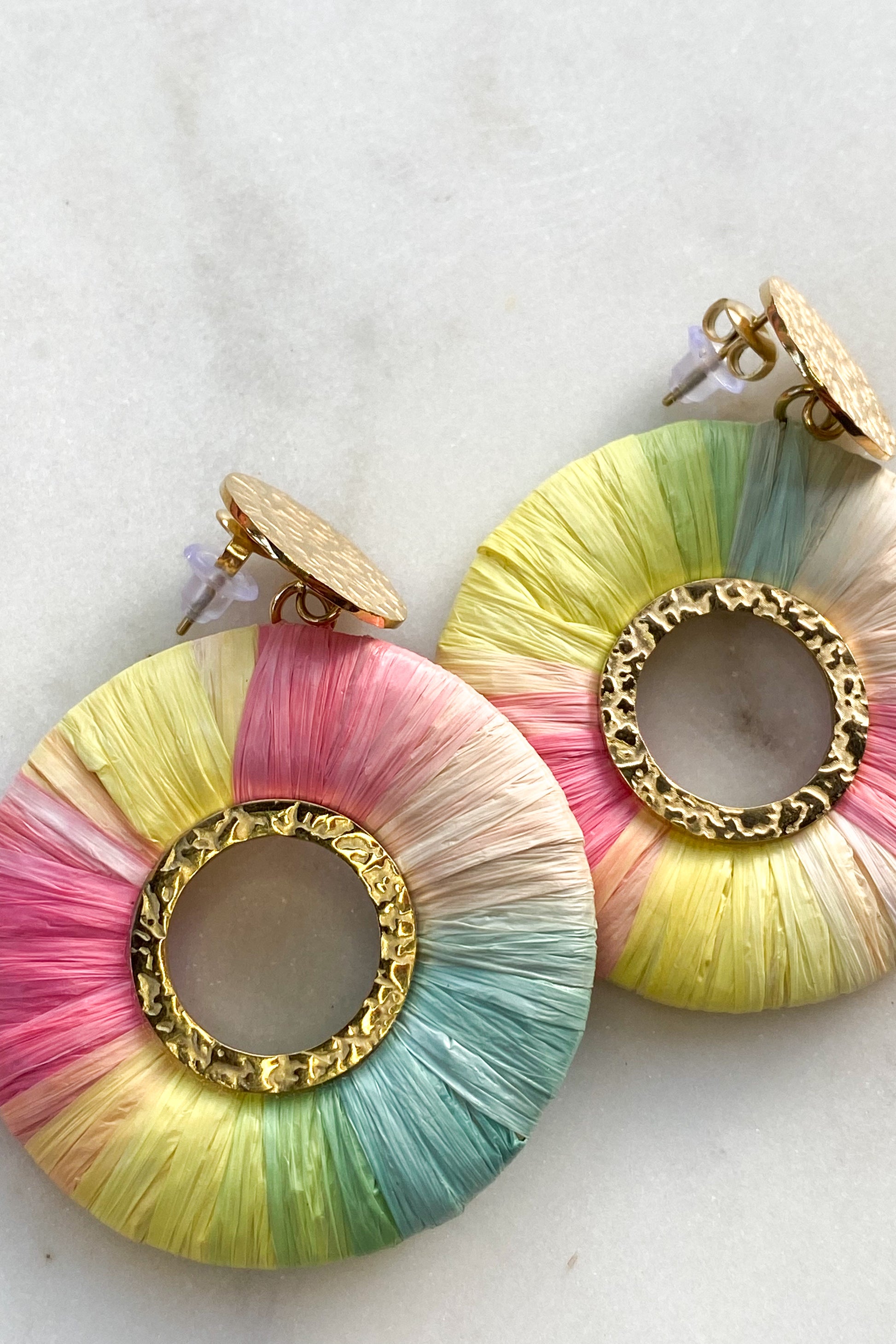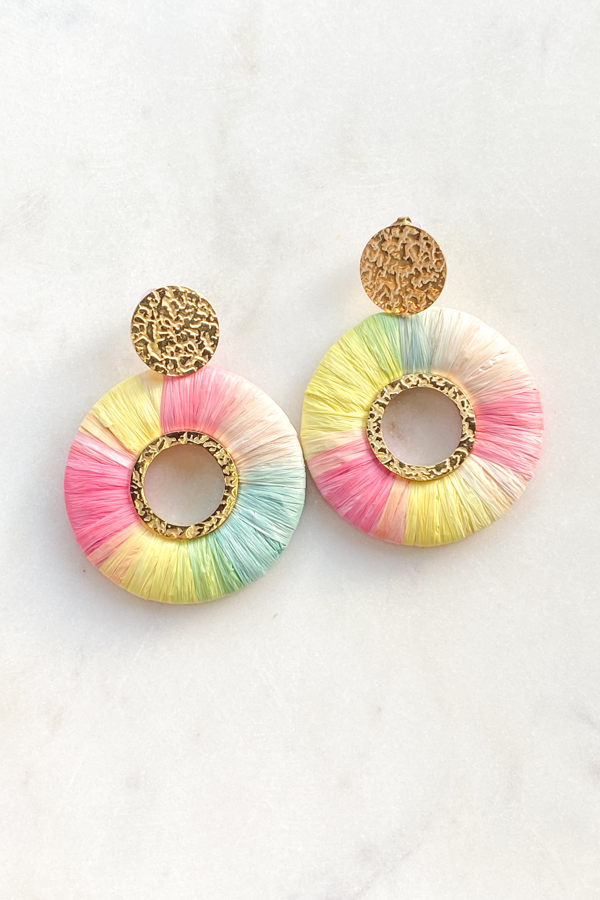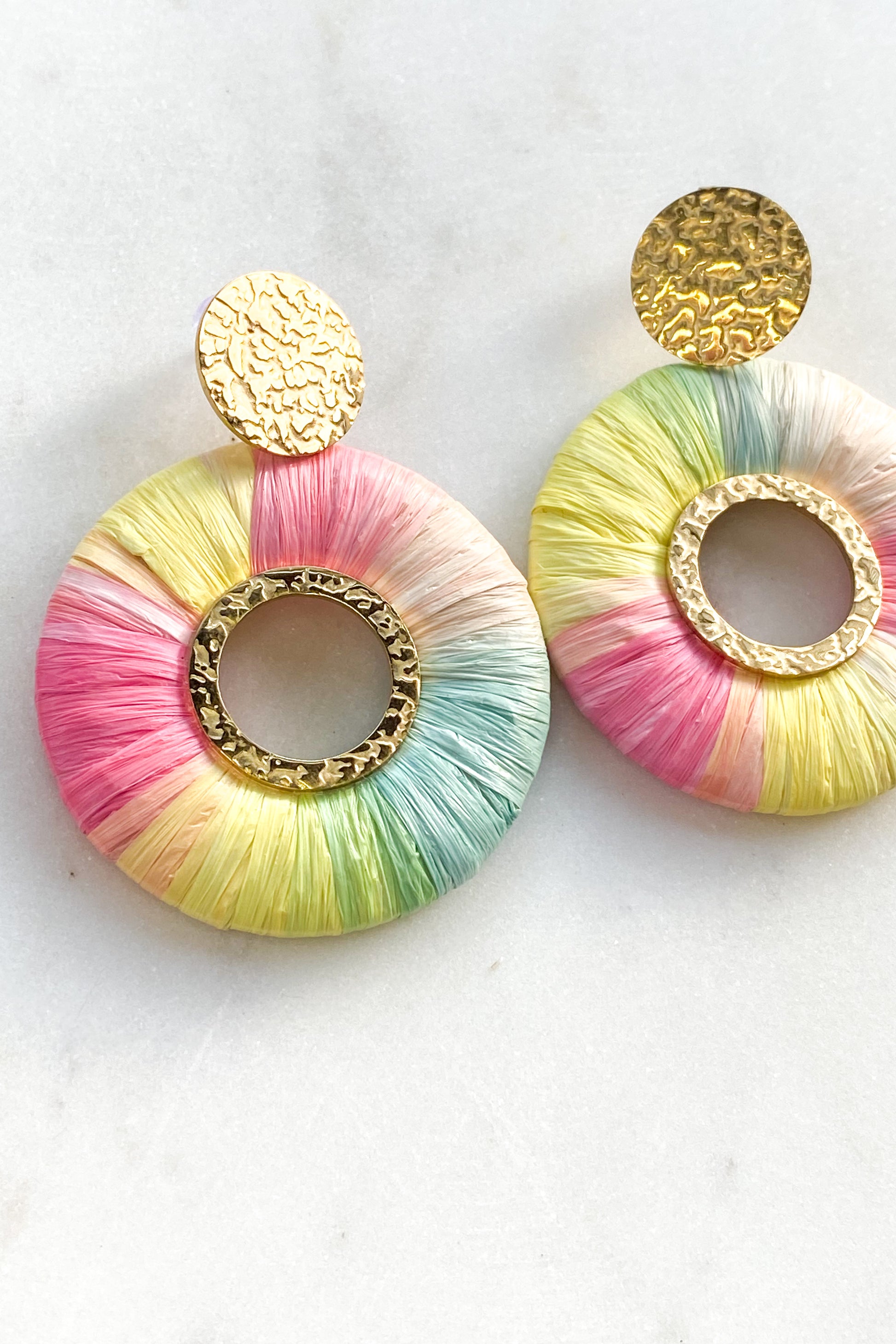 Geef je outfit een kleurrijke upgrade met deze statement oorringen. De oorringen combineren speelse pastelkleuren met een trendy ronde vorm en een luxe gehamerd gouden accent.