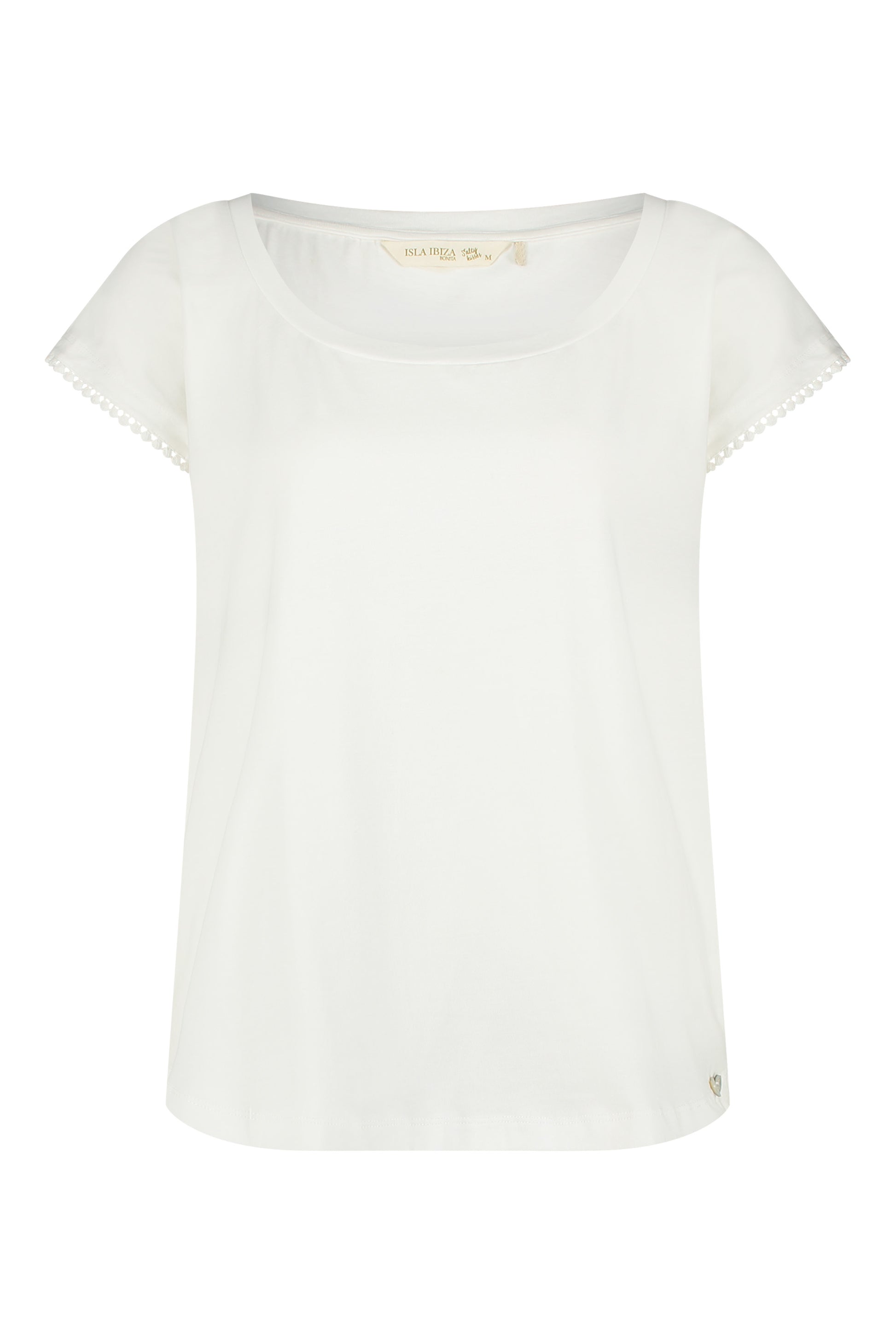 Ontdek de Isla Ibiza Breeze t-shirt. Een oversized wit shirt met kenmerkende hartvormige knoopjes aan de onderkant, een wijde ronde hals om off-shoulder te dragen en korte mouwen met een romantisch detail. Gemaakt van 100% katoen.