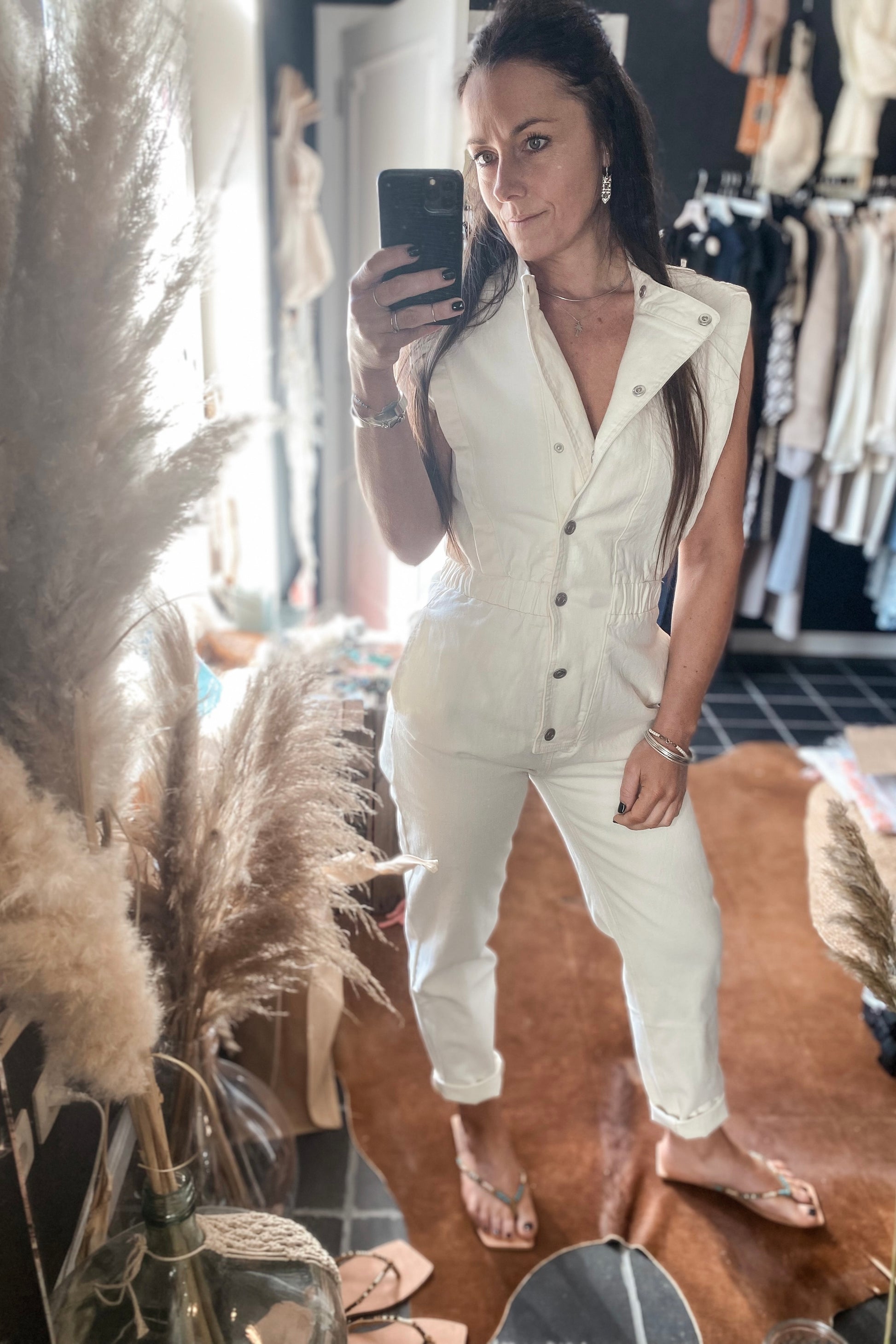 De Phoenix Jumpsuit van Circle of Trust, gemaakt van stretch katoen in gebroken wit, biedt ultiem comfort met een relaxed fit en elastische tailleband. De asymmetrische sluiting met drukknopen voegt een speelse touch toe, terwijl de zakken achteraan en zijdelingse insteekzakken zorgen voor functionaliteit en flair.