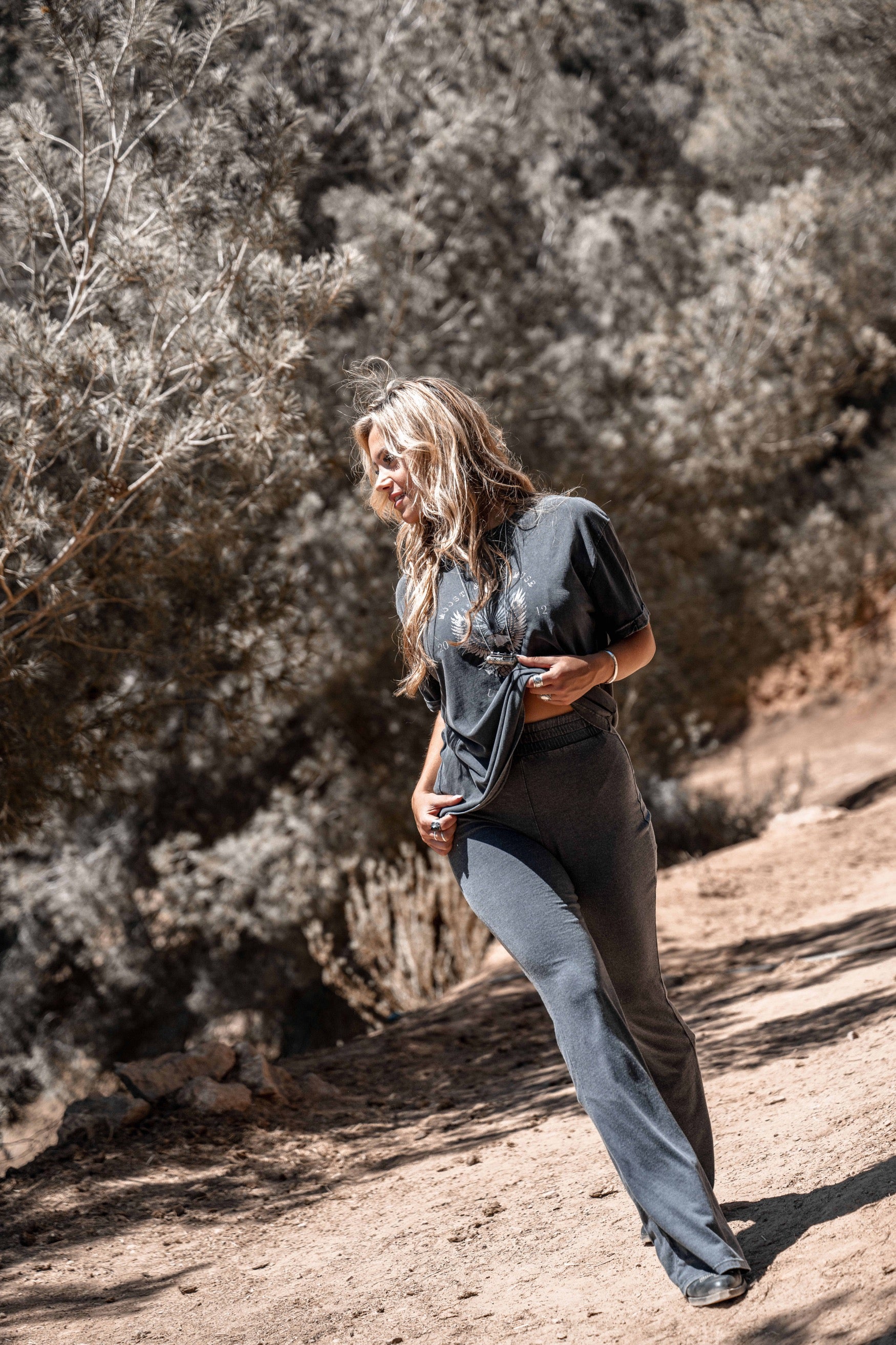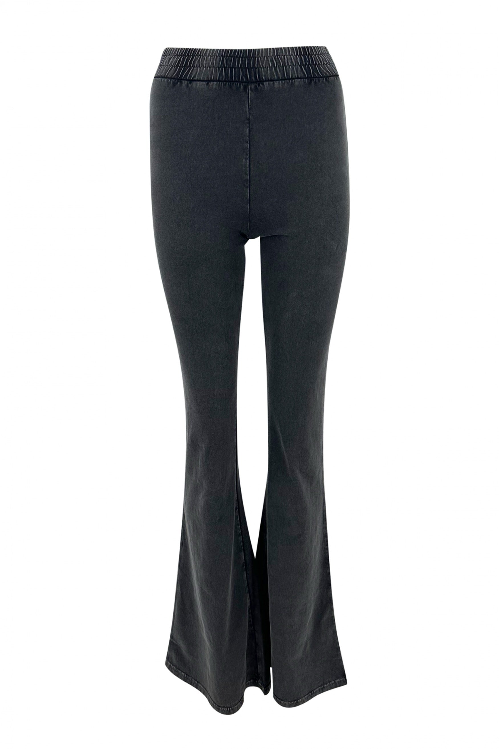 Comfortabele flared broek van zachte t-shirt stof met trendy wasjes grey look. Voorzien van een elastische tailleband voor een perfecte pasvorm en elegant wijd uitlopende pijpen. Combineer met de Sem T-Shirt voor een compleet relaxte en stijlvolle outfit!