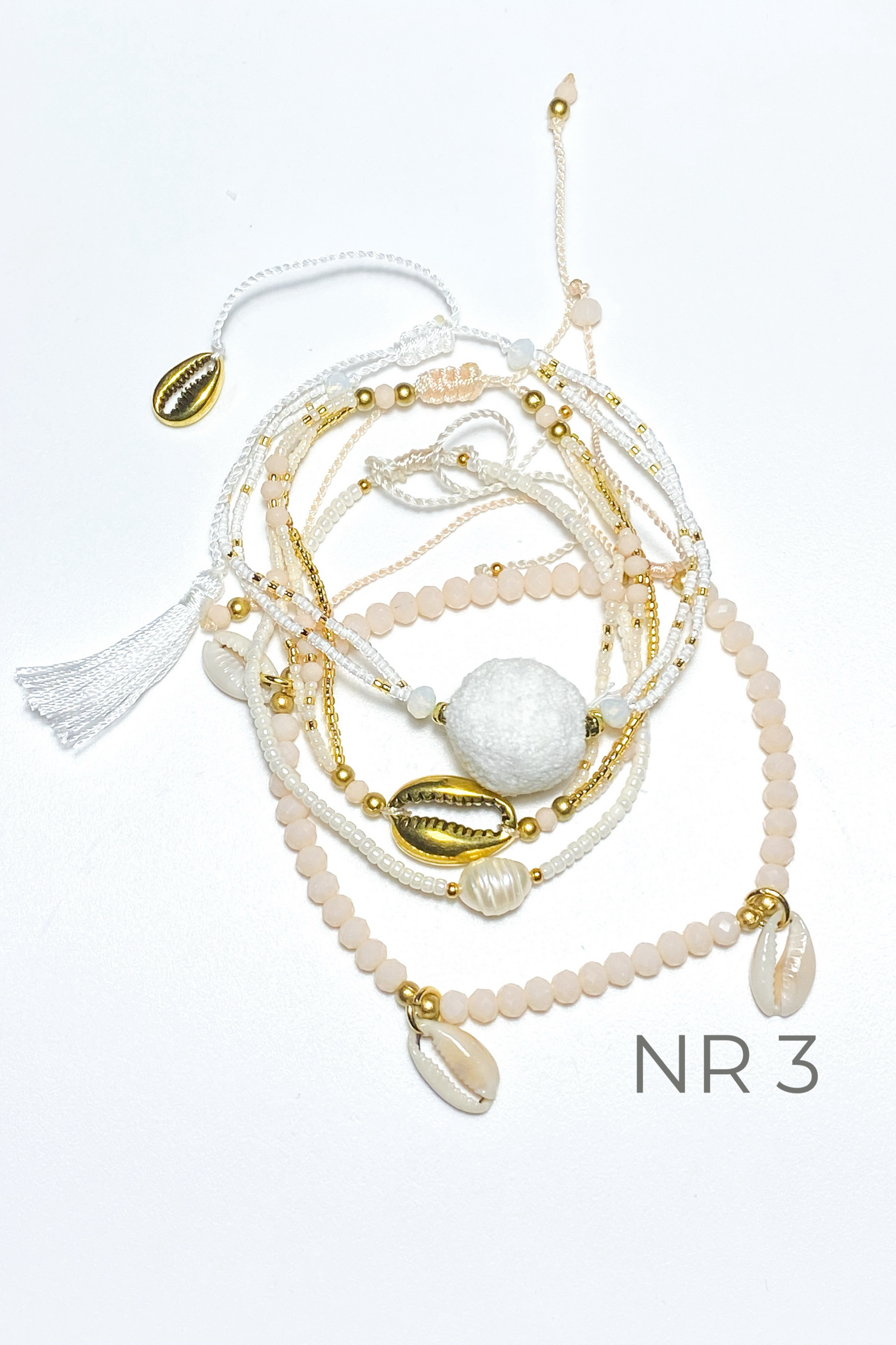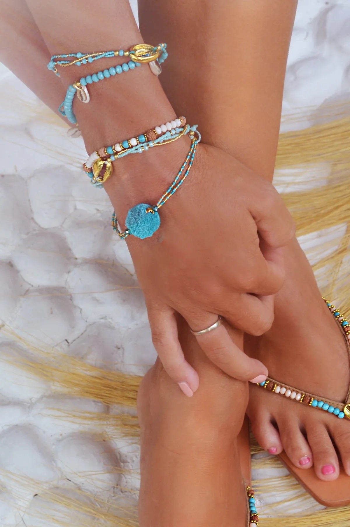 Laat je polsen van schitteren met de zomerse Papillon armbanden van Hot Lava. Deze set van 4 armbanden is handgemaakt en biedt een prachtige mix van pareltjes, schelpjes, kraaltjes en subtiele gouden accenten. Elk armbandje is mooi afgewerkt met trekkoorden, waardoor je de pasvorm gemakkelijk kunt aanpassen. Beschikbaar in prachtige kleuren Turquoise, Emerald en wit.
