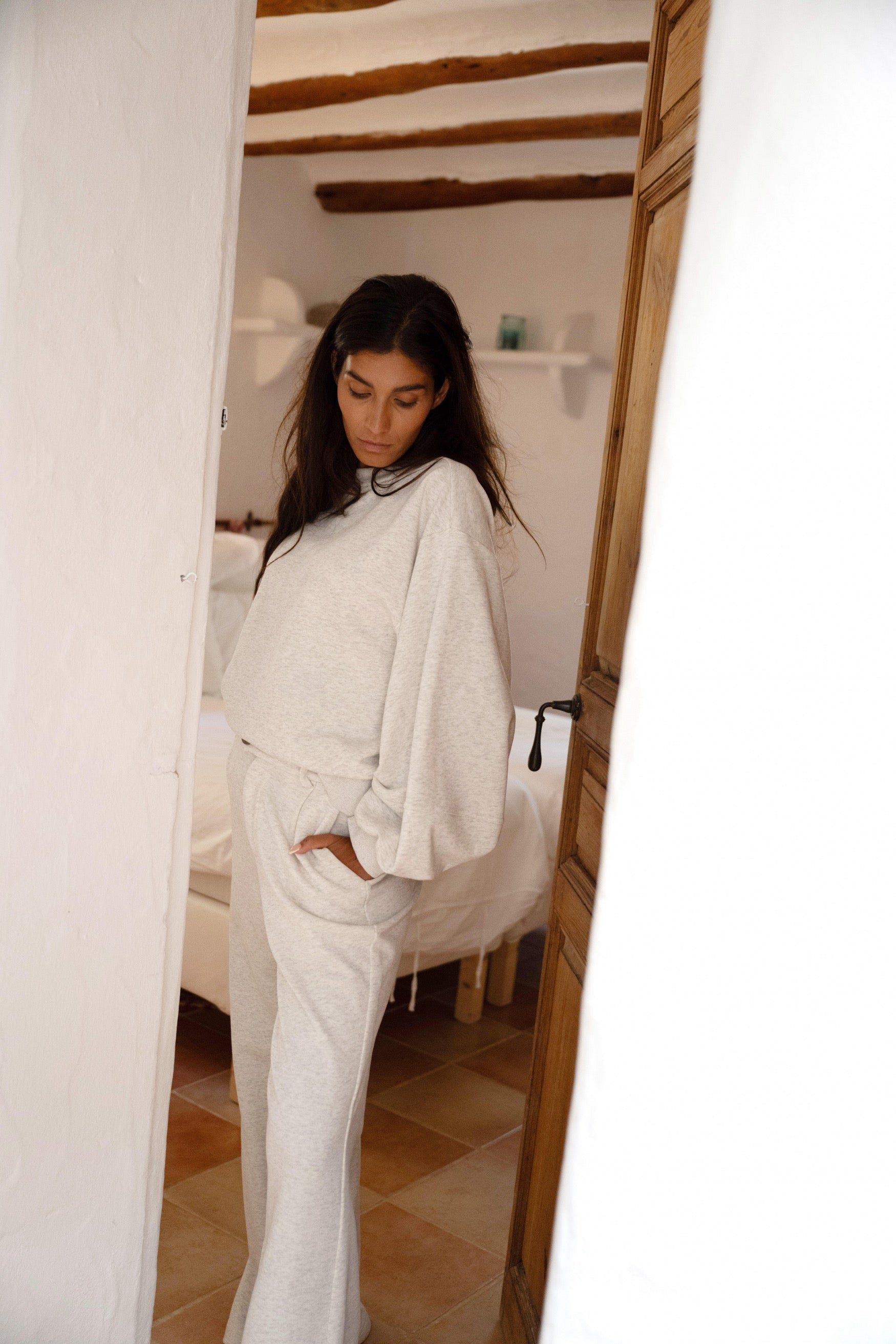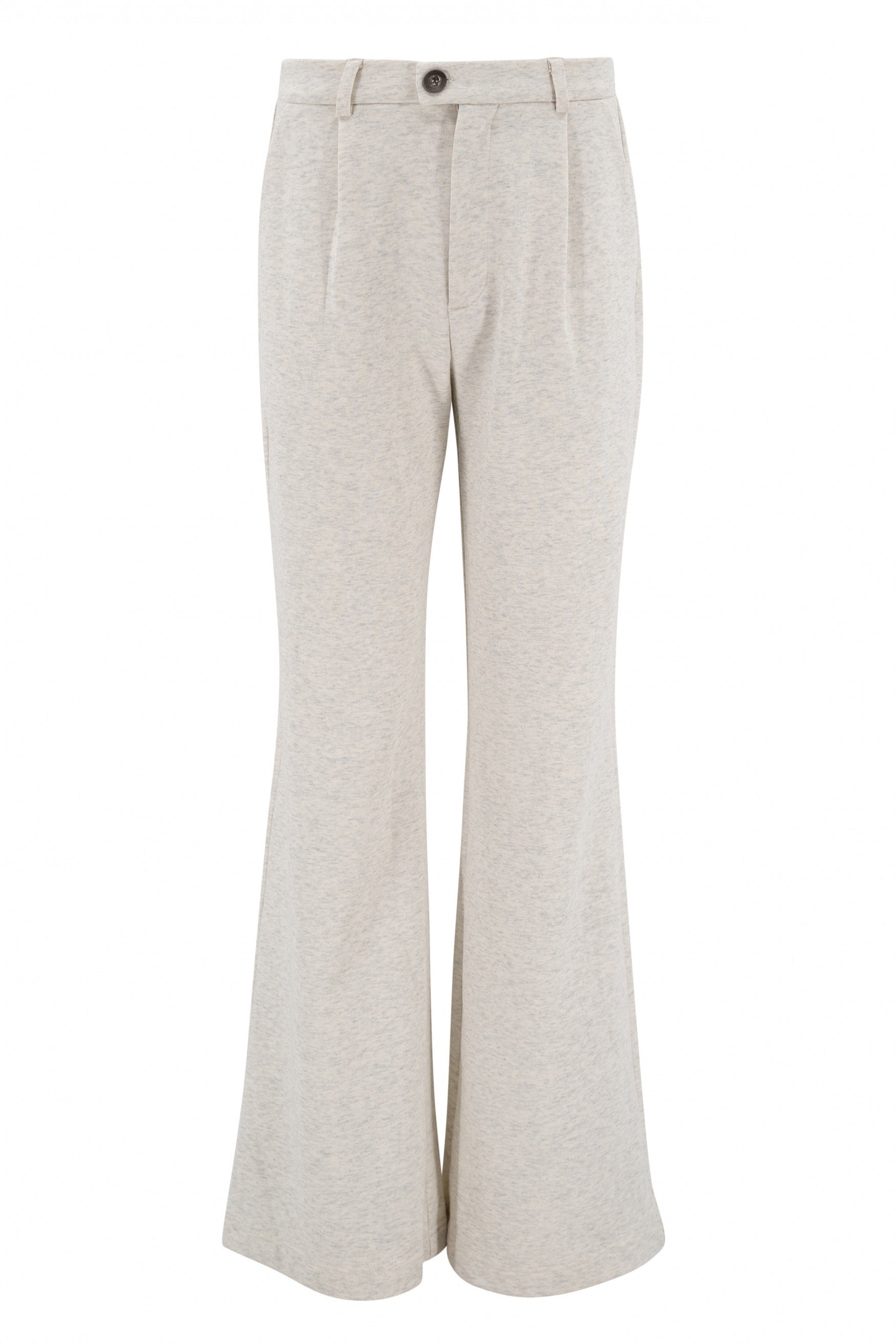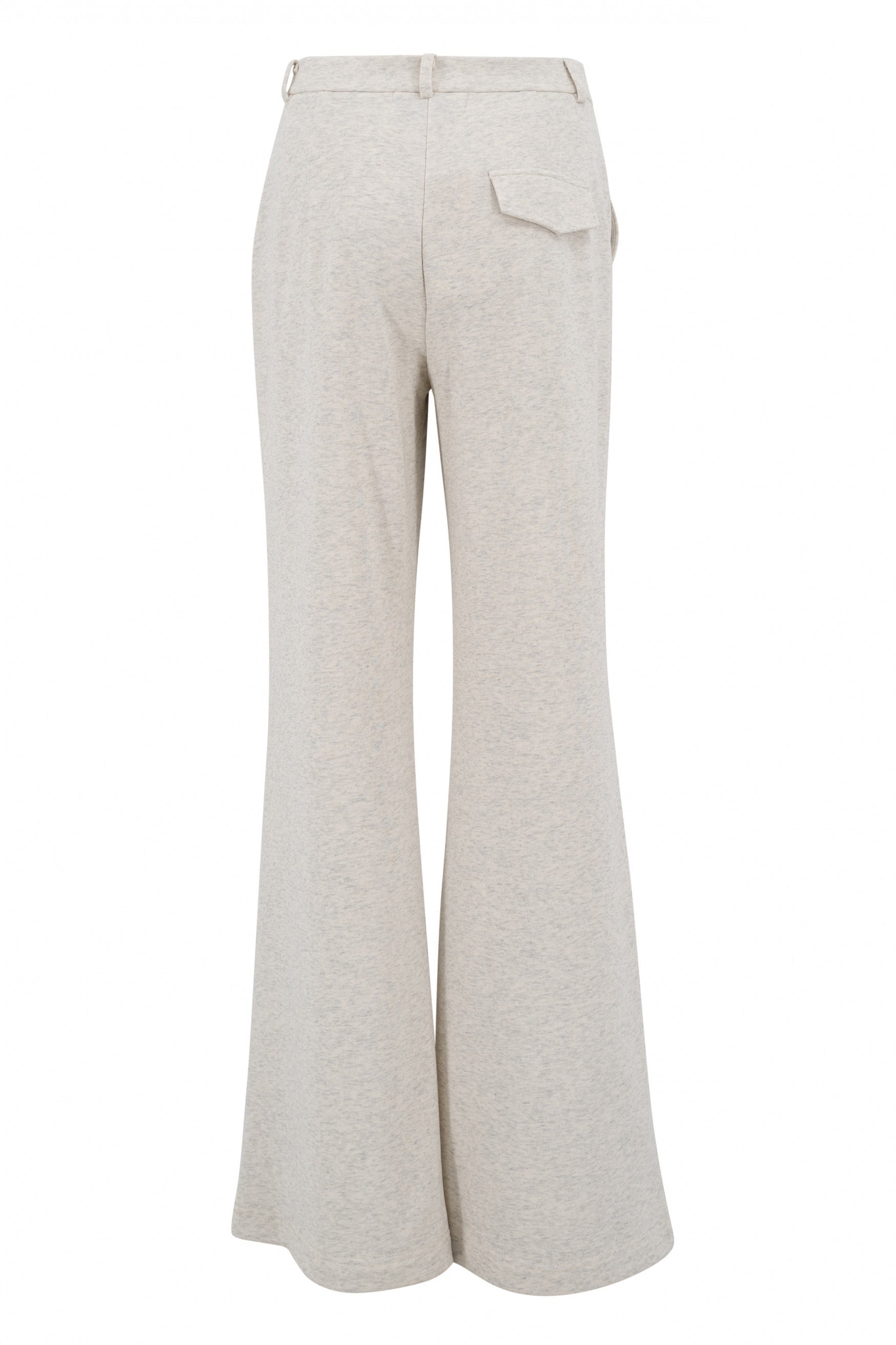 Elegante sweatpants in lichtgrijs melange met uitlopende wijde pijpen en een elastische tailleband achteraan voor extra comfort. Sluit met rots en knoop voor een verfijndere look. Combineer met de Severine Sweat Pullover voor de perfecte mix van stijl en comfort!