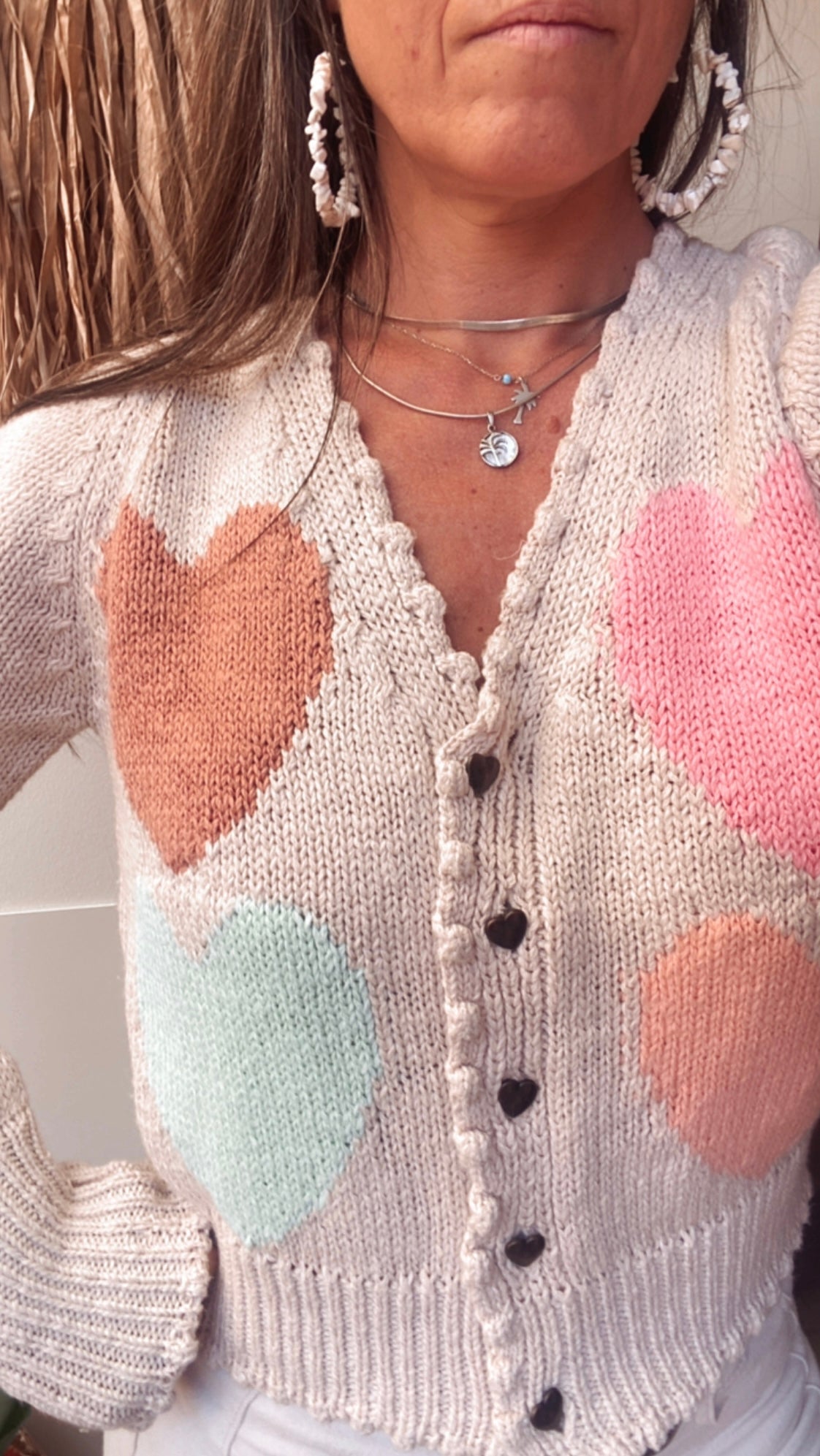 Breng bohemian vibes in je garderobe met de short Love Cardigan van Isla Bonita. Dit zomerse gilet is handgemaakt van 100% katoen en heeft een vrome kleur met speelse hartjes in zachte pasteltinten. De unieke hartvormige knoopjes geven het vest een romantische touch. Perfect voor frisse zomeravonden of als toevoeging aan je festival- of vakantie-outfit.