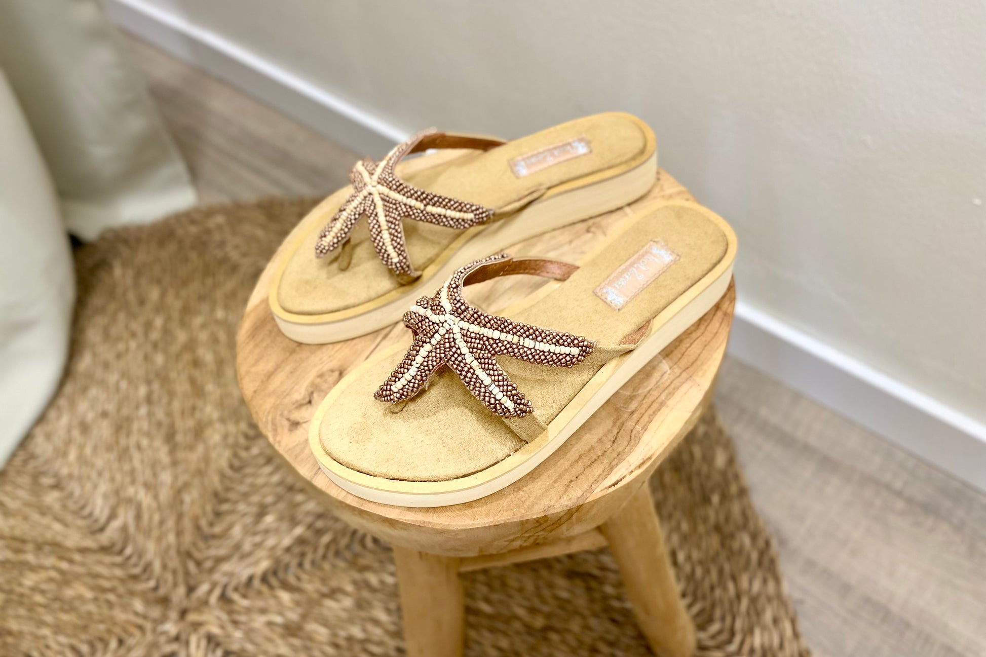 De iconische Starfish Slippers zijn naar een hoger niveau getild met een trendy plateauzool. Deze handgemaakte slippers zijn rijkelijk bezet met pareltjes in de vorm van een zeester, wat zorgt voor een luxe en bohemian uitstraling. Het zachte voetbed van mica en de stevige zool maken ze niet alleen stijlvol, maar ook comfortabel voor zomerse dagen. Perfect voor op het strand of een zomerse citytrip!
