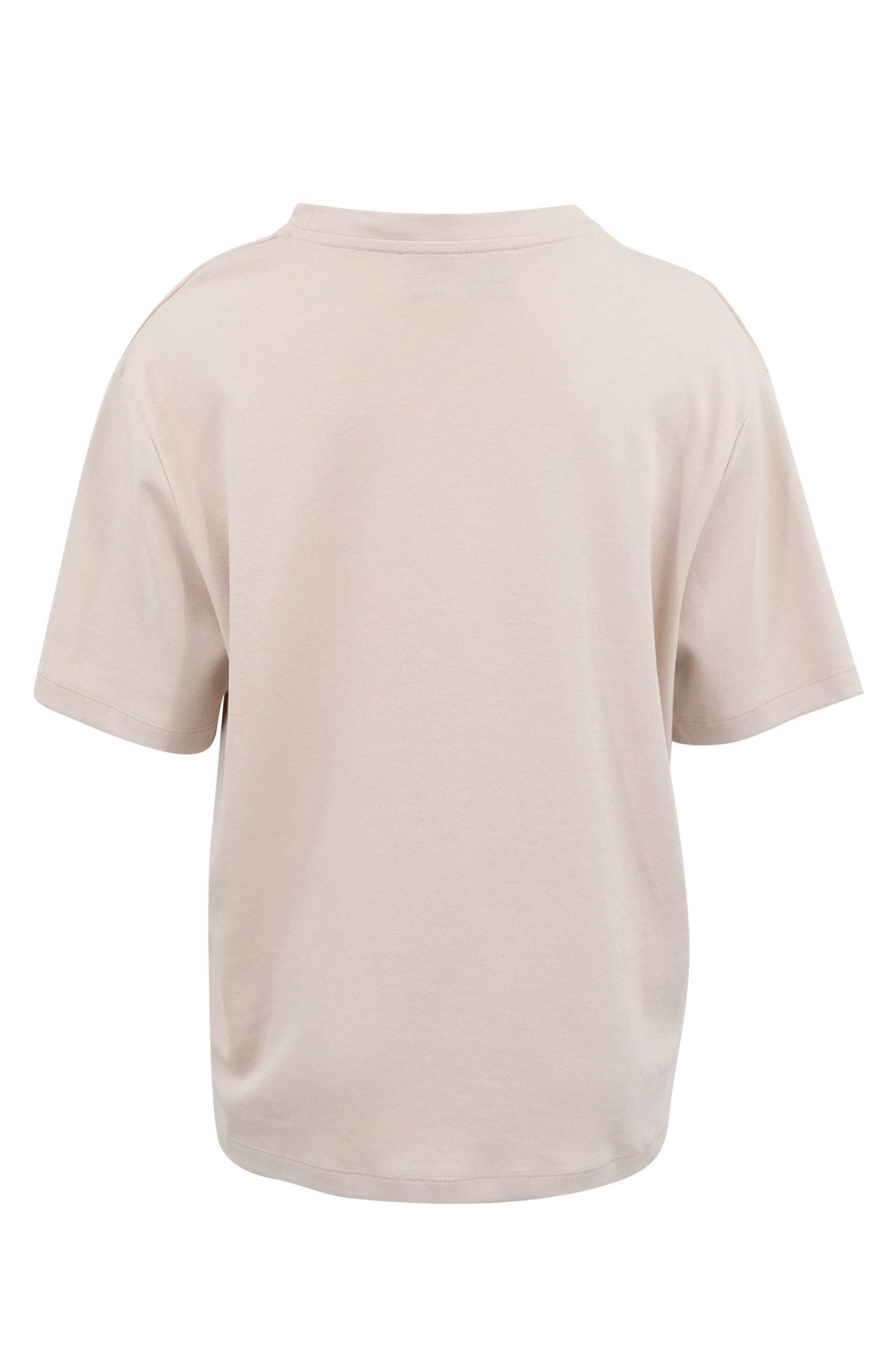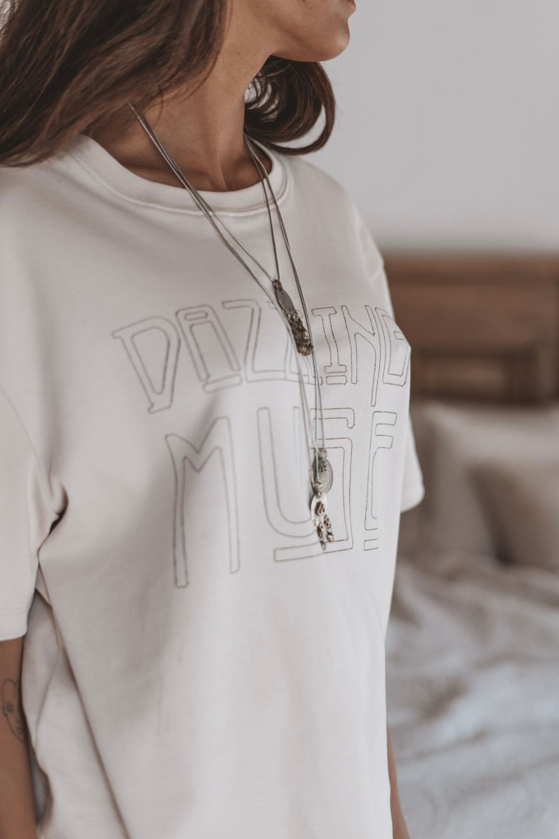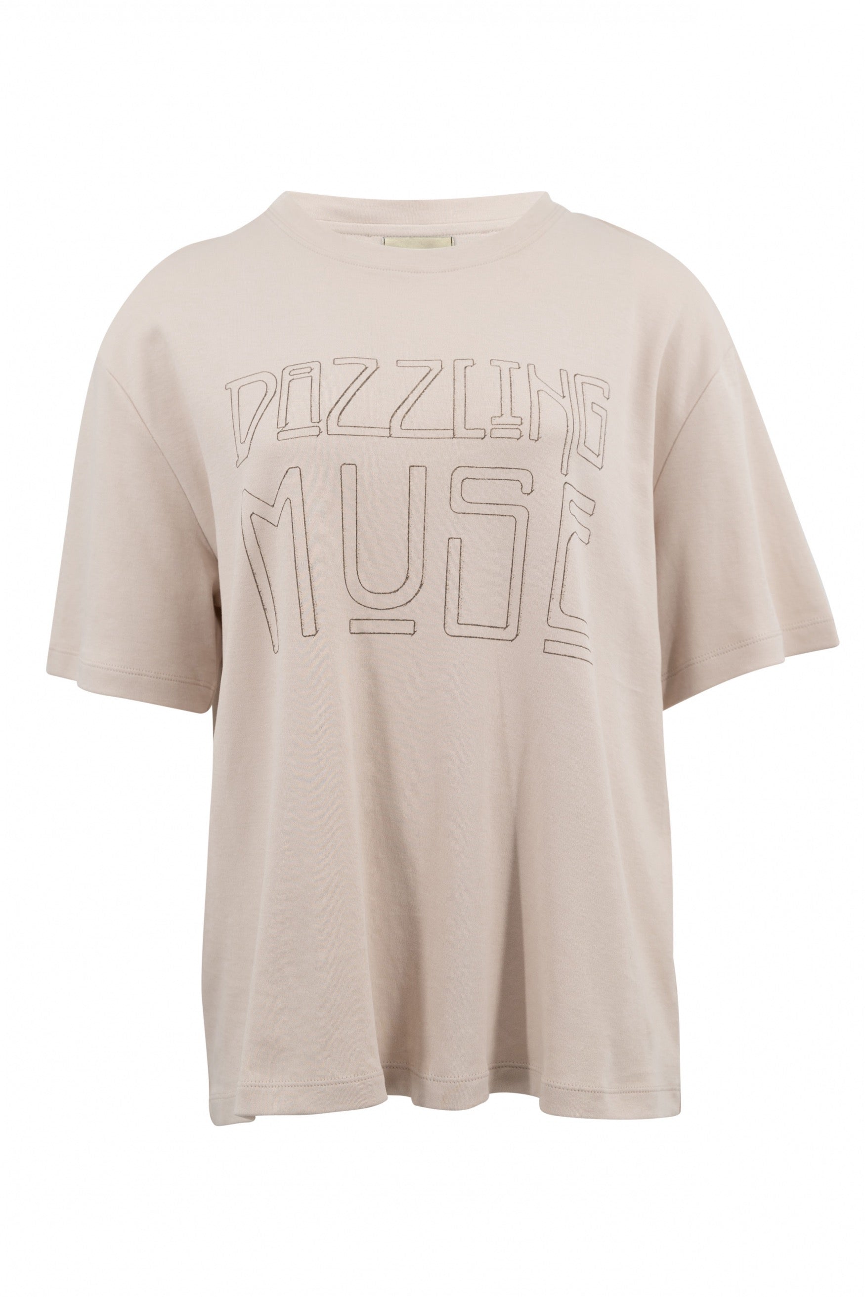 Deze stoere T-shirt van Moost & The Muse in licht beige heeft een subtiele print " Dazzeling Muse" die je outfit direct een artistieke touch geeft.
