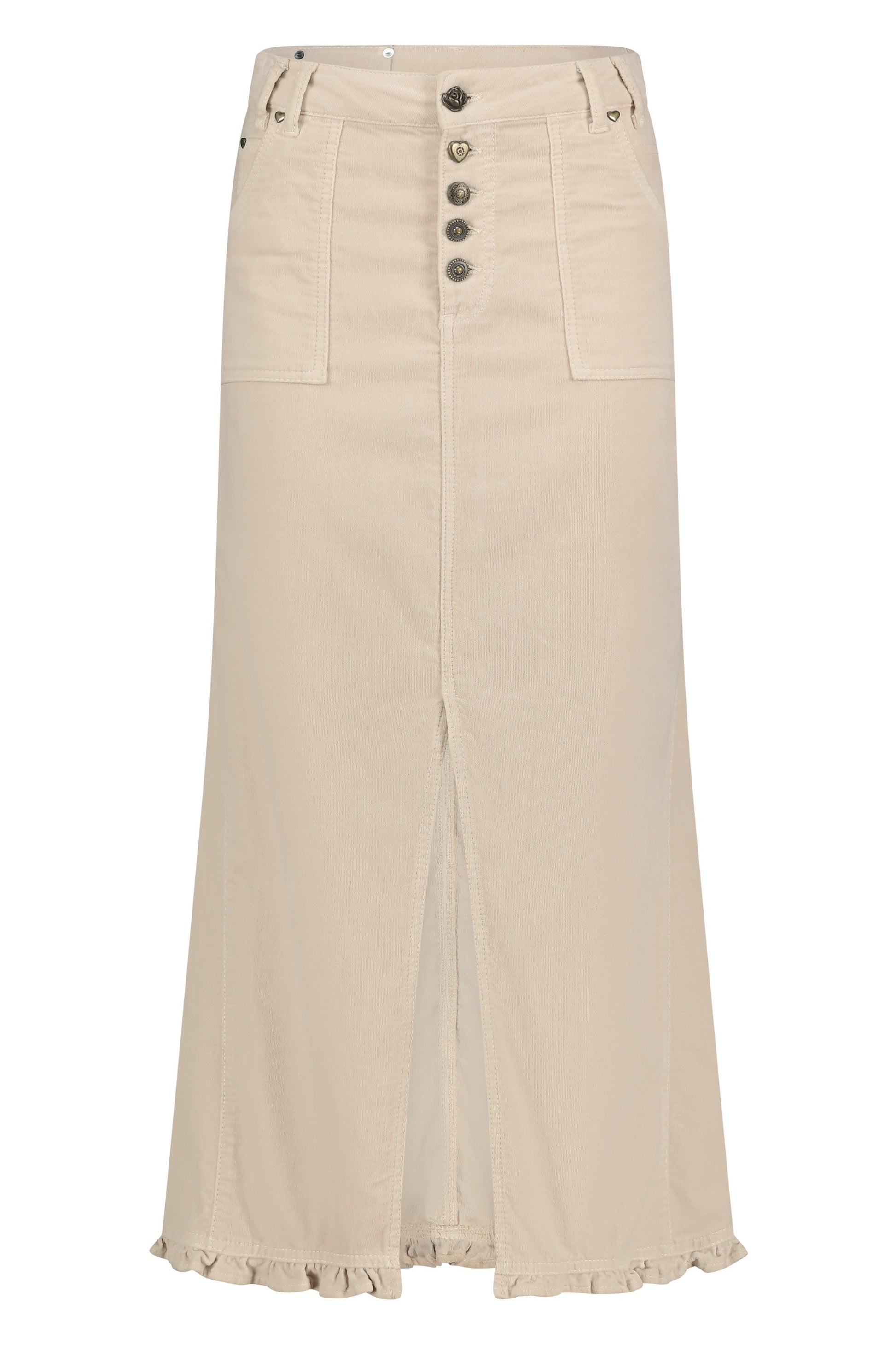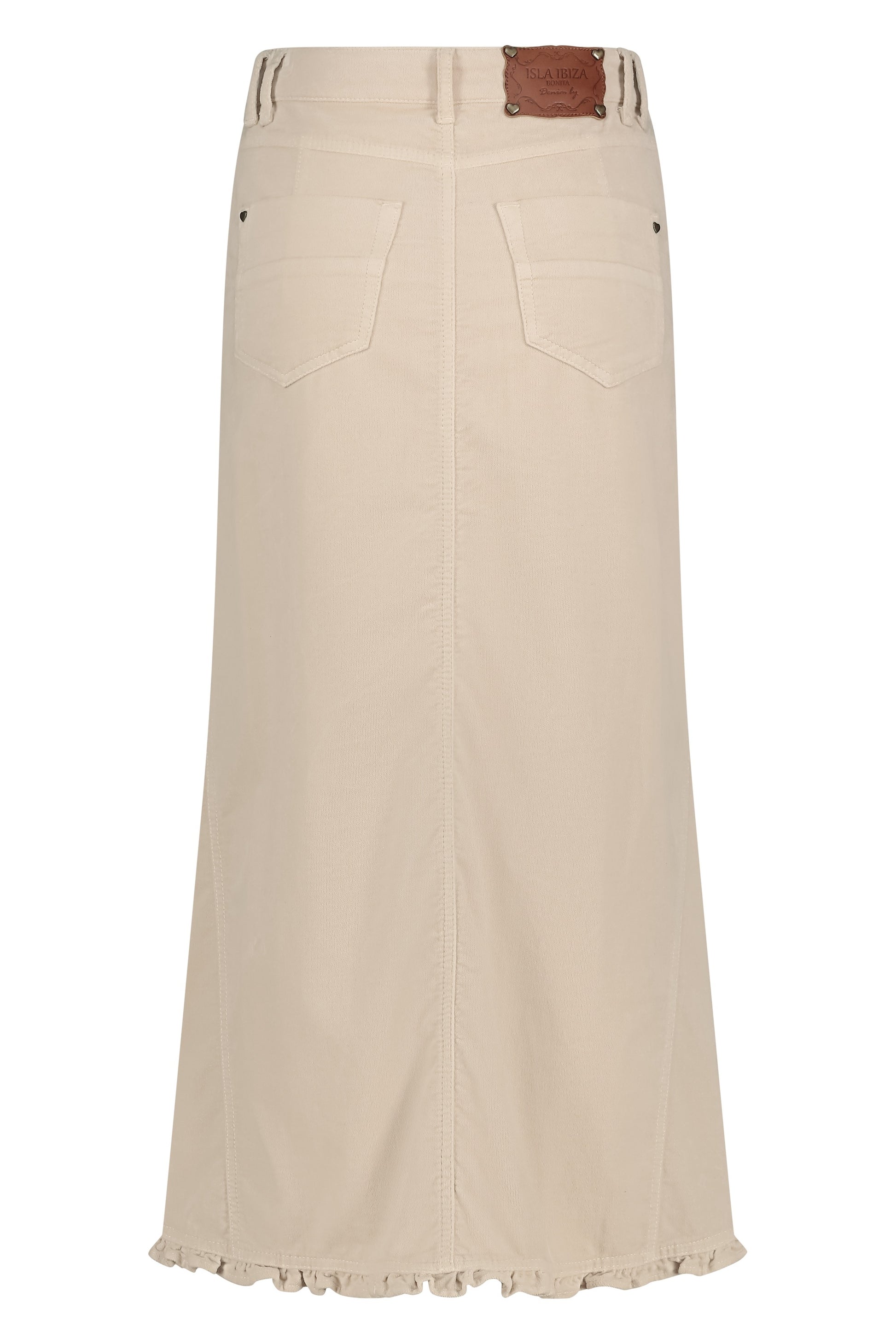 De Velvet Skirt van Isla Ibiza is een elegante, beige lange rok, afgewerkt met een stijlvolle ruffle boord die een speelse touch toevoegt aan je outfit.